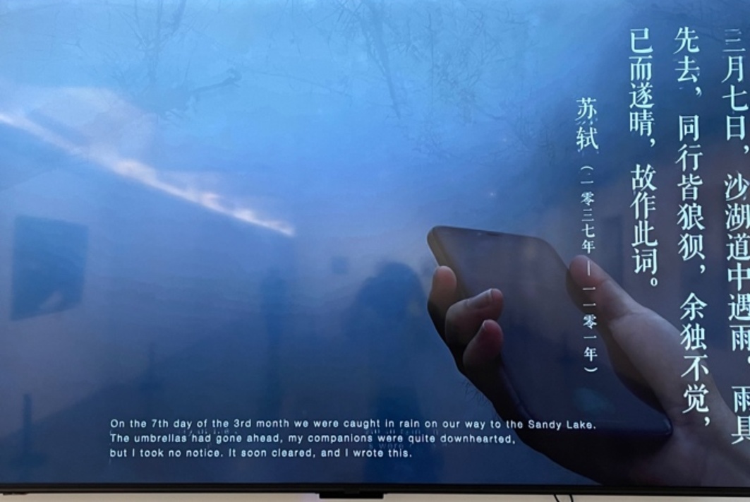 跨媒体综合影像是在数字媒体的基础上加以综合,具有综合性和创新性的特点,艺术家不受媒介的限制,将影像科技运用到最大化,更好地表达出自己的思考。杨泳梁此次展览中的作品《川流不息》(图7)以单通道视频的方式来创作,将数码技术与传统绘画互相嫁接,将城市与山水融为一体。在他的艺术实践中,试图将中国传统文人画的审美与当代艺术的表现相结合。那些看似超凡脱俗的山水,其中包含着大量零星散布的人类建筑,机械所构成的现代都市缩影。高郁韬另外了3个综合影像作品,是《对白系列》的《春江花月夜》与《定风波》(图8)《明月几时有》。《对白系列——春江花月夜》是艺术家在德国读书时创作的,这件作品是他在德国的莱茵河拿着手机和Siri一起读诗,在异乡孤独的时候,读古诗找一种灵魂寄托。异乡与中国,古代与当代,两个对冲创作力这件艺术作品。《对白系列——定风波·莫听穿林打叶声》是艺术家刚回国的时候创作的,作品拍摄的这个地方是他的家乡湖南,表达了他当时刚回国迷茫又无所畏惧的一种心态。《水调歌头·明月几时有》这件作品,没有与手机对谈,表达了过山车的恐惧将所有情绪抽离,对诗的情绪都被泯灭了,是一种黑色幽默。高郁韬的静态摄影主要体现了物质与空间属性,而这三件作品运用动态摄影和复合技术表达了物质与情感的对冲,更能引人思考。