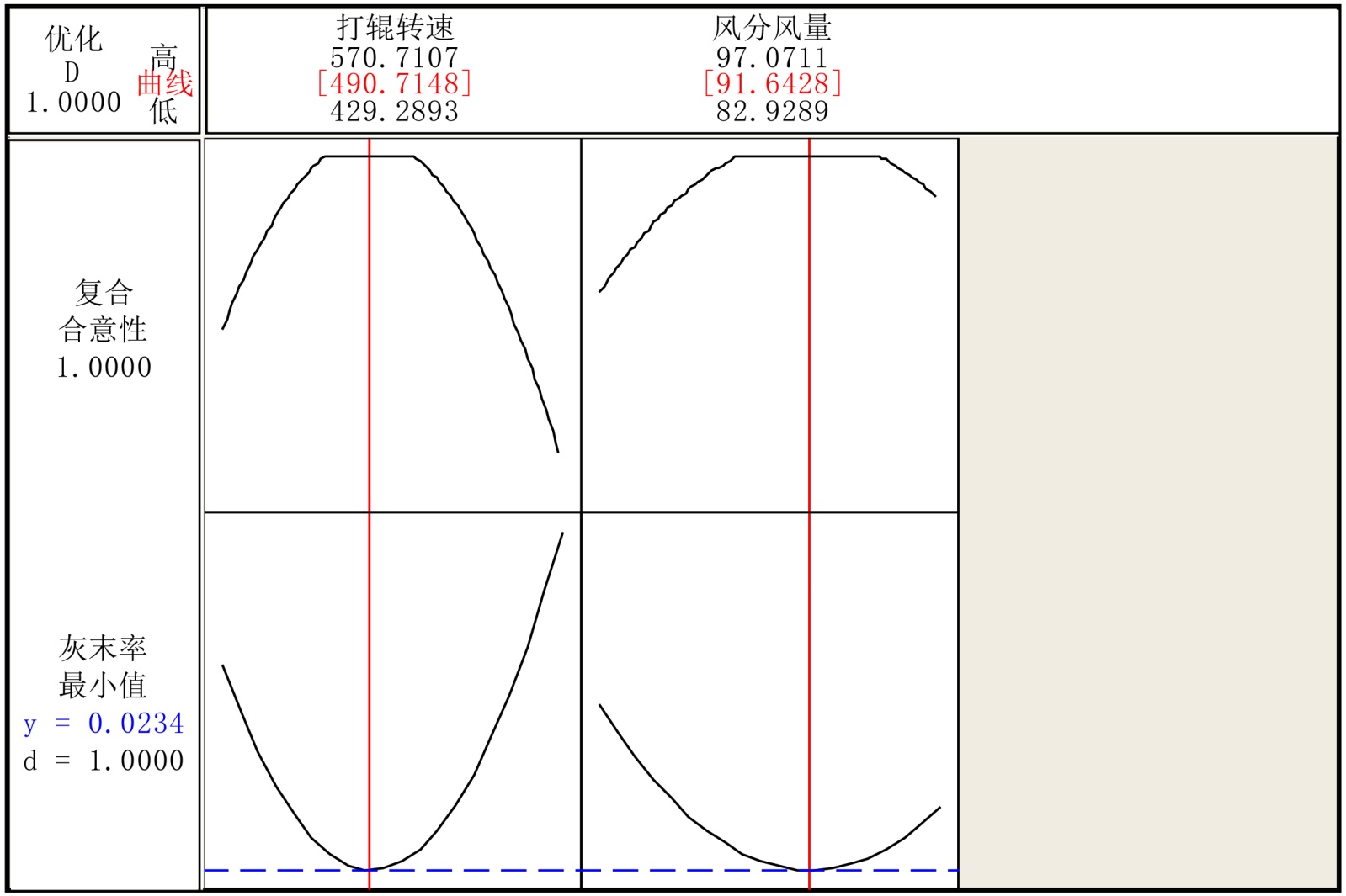 通过响应曲面设计和工艺参数优化,我们得到:打辊转速490 r/min,风分风量91%时,灰末率达到最小值2.34%。