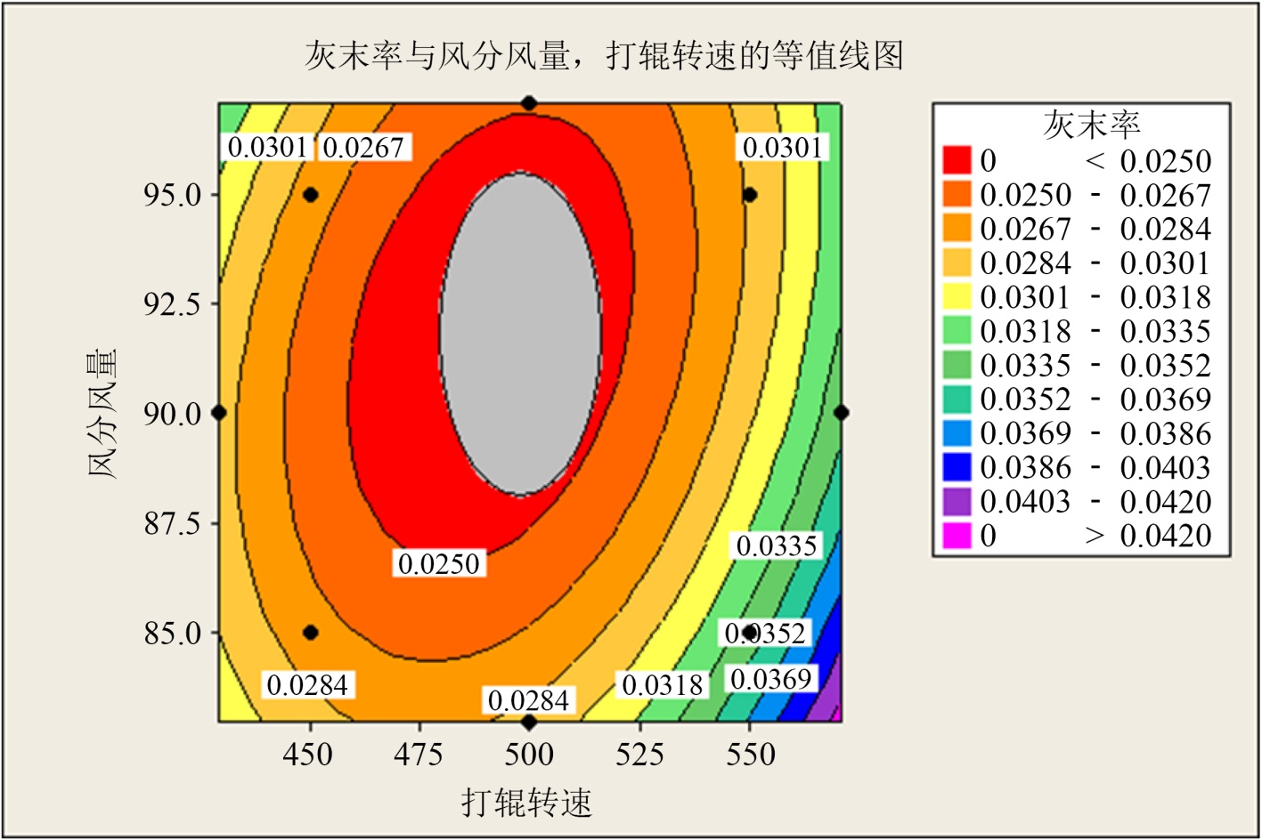 图3. 灰末率与风分风量、打辊转速的等值线图