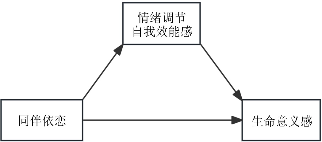情绪调节自我效能感(Regulatory Emotional Self-Efficacy, RSES)的三维结构模型认为,情绪调节自我效能感可以形成从认知评估到行为应对的完整闭环机制(Bandura & Locke, 2003)。个体通过调节对环境刺激的认知加工路径,激活个体内在心理资源获得生命意义感(刘丽娟,2021)。多项研究表明,高情绪调节自我效能感个体在负性情绪诱发情境中表现出更高的控制感与应对信心,能有效缓解焦虑、抑郁等负性情绪反应,增强对自身能力与价值的积极评价,最终提升个体生命意义感(Thartori et al., 2021; 何炎宸,2025)。基于此,本研究提出假设2:同伴依恋、情绪调节自我效能感和生命意义感三者之间显著正相关;假设3:情绪调节自我效能感在同伴依恋与生命意义感的影响中起中介作用。中介效应模型图如图1所示。