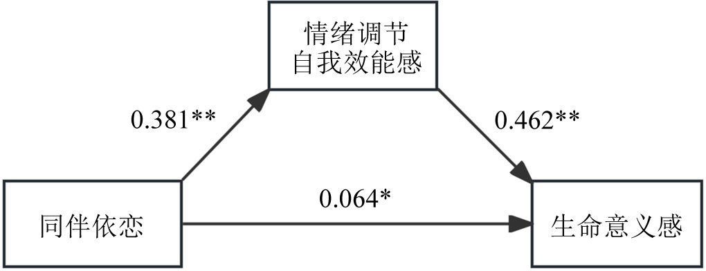 本研究相关分析发现,同伴依恋、情绪调节自我效能感和生命意义感之间两两显著正相关。良好的同伴依恋个体表现出更高水平的情绪调节自我效能感和生命意义感,这与以往的研究结果相同(Liu et al., 2021; 郭宇洁,2020),表明拥有高质量同伴依恋的个体会体验到更多的生命意义感,说明在青少年时期,个体同伴依恋需求的满足程度对身心健康发展有至关重要的影响(曾晓强,2009)。个体通过与周围人建立联系并在亲密和互惠关系中提高幸福感和个人意义感(Stillman et al., 2009)。依据皮亚杰的认知发展理论,青少年个体处于形式运算阶段,同伴互动是其社会认知发展的重要途径与载体。通过与同伴的平等交往及观点碰撞,个体得以摆脱自我中心思维建构起更为成熟的社会认知与自我概念;而清晰的自我认知是生命意义感建构的核心前提,这为同伴关系对生命意义感的积极影响提供了重要的理论佐证。对于青少年来说,同伴是个体最重要的亲密关系之一,是青少年满足亲密感、安全感和信任等社会性需要、获取社会支持的重要来源,对个人的身心发展有重大影响(Mota & Mators, 2013)。具有良好同伴依恋关系的个体在与同伴的相处中更易形成密切的联结,他们可以从同伴关系中获得更多情感和社会支持,从而有效满足亲密、安全与归属的需求,这有助于个体更好地形成积极的生命意义感(马茜芝,张志杰,2020)。由此可见,从同伴依恋的角度出发,鼓励发展同伴间的亲密关系,给彼此提供足够的社会支持与安全感,形成安全的同伴依恋关系,对提高青少年的生命意义感具有一定现实意义。