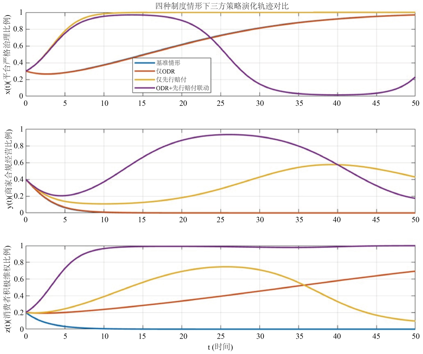 为检验《直播电商监督管理办法》提出的先行赔付与在线争议解决(ODR)等制度安排对平台–商家–消费者三方策略演化的影响,本文在前述复制动态方程基础上进行数值仿真。F0对平台不同治理策略具有对称性,在相对收益比较中被抵消,其作用主要体现在抬高先行赔付机制的长期运行门槛而非改变治理强度的演化方向,因此属于制度可行性问题而非演化路径问题。具体初始参数设置如:x0 = 0.30,y0 = 0.40,z0 = 0.20,C1 = 1.35,C2 = 0.85,J = 1.20,α = 0.65,β = 0.25,Pm = 0.90,K = 1.0。λ0 = 0.35, ρ = 0.20,g1 = 1.0, g2 = 0.5,根据追偿成功率函数,得出λ1 = 0.55,λ2 = 0.45。基准情形下,Lp = 0.60,γ = 0.25,Cc = 0.60,Q = 1.00;仅ODR情形下,Lp = 0.60,γ = 0.25,Cc = 0.20,Q = 1.00;仅先行赔付情形下,Lp = 1.20,γ = 0.60,Cc = 0.50,Q = 1.20;ODR+先行赔付联动情形下,Lp = 1.20,γ = 0.70,Cc = 0.15,Q = 1.20。