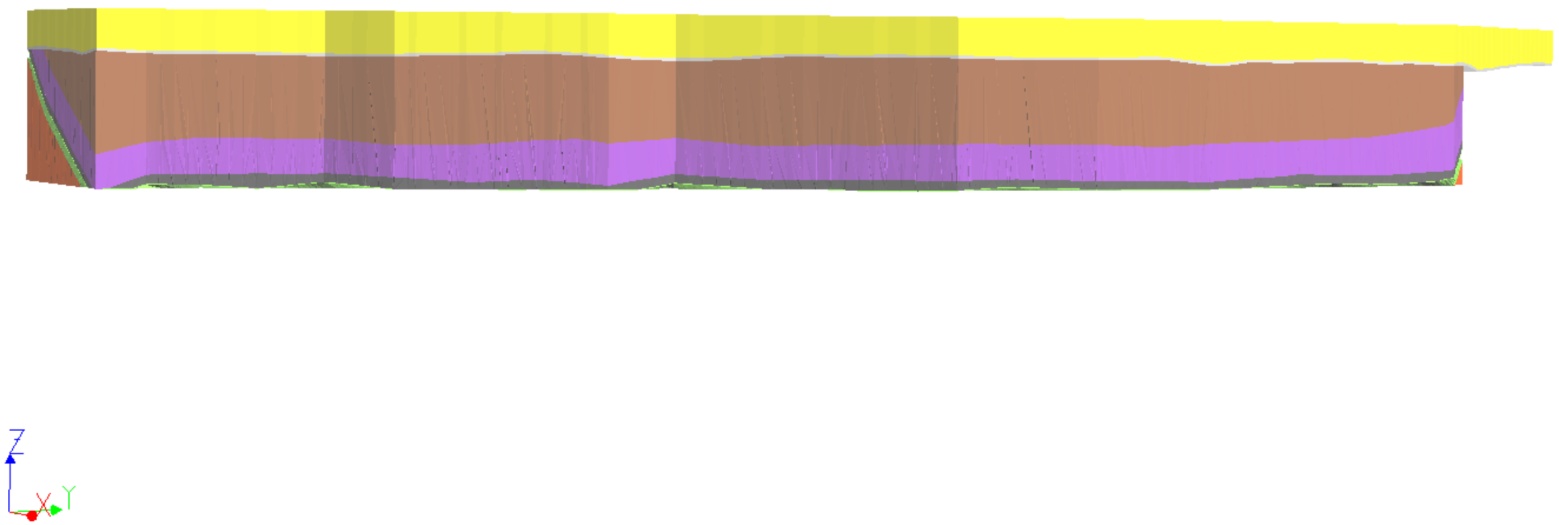 数据预处理是三维地质可视化的基础,其核心目标是确保模型数据的准确性与兼容性。首先在AutoCAD中进行地层剖面线提取:基于矿区1:2000地质勘探剖面图,通过图层特性功能筛选出各套地层的顶底板界线、断层破碎带界线及矿体边界线,利用多段线编辑工具对剖面线进行平滑处理,去除冗余节点与异常线段,确保剖面线的连续性与准确性。随后将处理后的剖面线数据以DXF格式导出,导入GoCAD软件进行三维地质建模。在GoCAD中,通过剖面线约束功能对齐不同剖面的同名地层界线,采用层状建模法构建各套地层的三维曲面,结合实体布尔运算整合矿体与断层模型,最终形成包含7套地层及2条断层的完整矿区三维地质模型,并导出为DXF格式文件,GoCAD所建地质模型如图1所示。将导出的DXF格式模型导入到3dsMax,然后在3dsMax中将模型导出为OBJ格式,同时生成对应的MTL材质文件,用于区分不同地质体的物理属性。