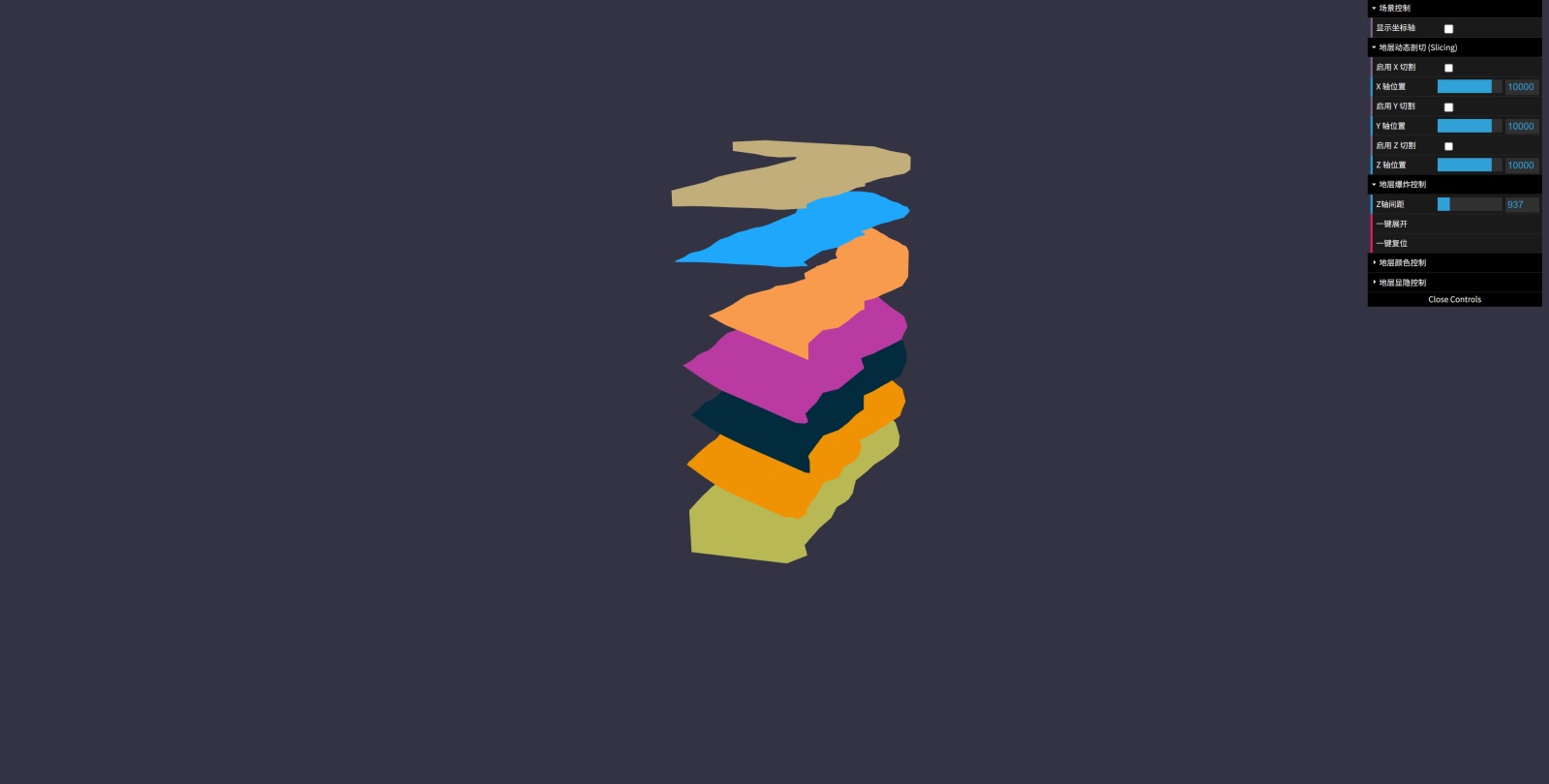 为满足用户对矿区地质模型的多角度观察与精细化分析需求,引入OrbitControls控制器构建全方位交互式操作体系。该控制器支持鼠标左键拖拽旋转、右键拖拽平移、滚轮缩放等基础操作,同时设置旋转角度限制,水平旋转范围为360˚,垂直旋转范围为−90˚~90˚,有效避免模型观察视角倒置;通过将控制器阻尼系数设置为0.05,使旋转、平移等交互操作具备自然的惯性效果,显著提升操作流畅性。此外,系统新增多维度交互功能:一是设计地层显隐控制面板,支持对各套地层模型进行独立的显示与隐藏控制,便于用户聚焦分析目标地层的空间特征;二是实现了基于模板缓冲区的任意平面动态剖切功能。针对地质体内部结构不可视的痛点,系统利用Three.js的ClippingPlanes特性,允许用户在场景中交互式定义一个或多个剪裁平面。为了解决模型剖切后产生空心断面的视觉缺陷,本研究开发了断面补全算法,利用WebGL的模板测试机制,在渲染管线中对被剪裁平面的背向面和正向面分别进行计数操作。当视线穿过奇数个面片时,判定为模型内部区域,并对其进行颜色填充渲染。该功能使用户能够像切蛋糕一样,沿任意角度如勘探线方向实时剖切地质模型,清晰揭露隐伏矿体与围岩的穿插关系及断层在深部的产状变化,极大地增强了地质模型的三维空间分析能力。三是基于射线检测技术实现坐标实时反馈,用户点击地层任意位置时,系统可精准捕获点击点的三维空间XYZ坐标并即时显示,为地质体空间位置分析提供精准数据支撑;四是开发地层一键爆炸分离功能,触发该功能后各地层将沿预设空间轴自动分离,清晰展示层间接触关系与空间叠置结构;四是增设地层颜色自定义功能,用户可针对不同地层独立调整显示颜色,通过差异化色彩配置提升不同地层的视觉辨识度。同时,系统添加窗口大小自适应功能,当浏览器窗口尺寸改变时,自动调整相机宽高比与渲染器尺寸,确保可视化效果不受窗口缩放影响;并设置矿体、断层等关键地质体的视角切换按钮,点击后相机会以平滑过渡的方式自动飞行至预设视角,快速聚焦目标地质体。