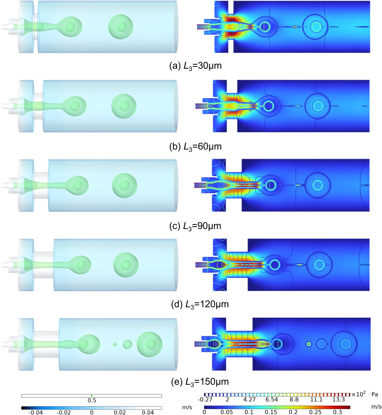 本节研究了聚焦孔颈长L3 (设为30、60、90、120、150 μm,聚焦孔直径固定为150 μm,其余参数同3.2节)对双乳液滴生成的影响。如图9体积分数图所示,所有工况均为射流模式,且射流长度随L3增加而增长。当L3在30 μm∼120 μm范围内时,射流在出口处保持稳定,形成连续均匀的射流束并断裂为完整外液滴。相关模拟结果见图9、图10。当L3 = 150 μm时,此时聚焦孔颈过长,射流在流动过程中失去有效约束,伴随出现卫星液滴,由于卫星液滴的尺寸较小,运动速度高于双乳液滴,一段时间后追赶上双乳液滴并与之融合。从右侧压力和速度云图可知,随L3增大,聚焦孔区域的流速梯度变平缓,同时压力分布的集中程度降低。