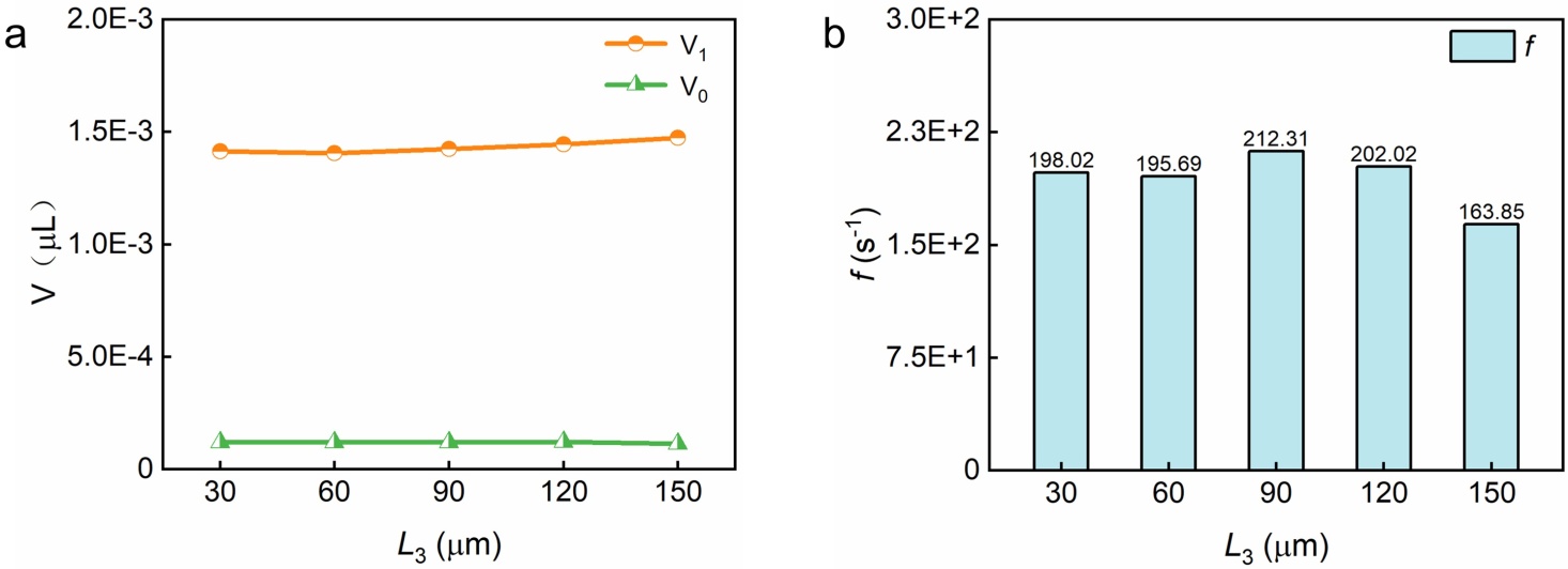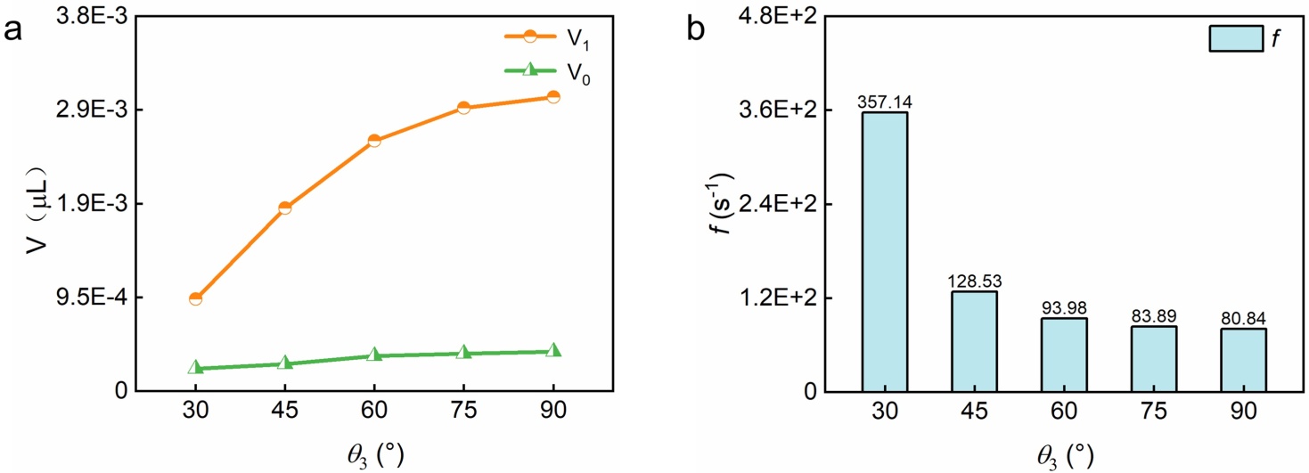 Figure 12. (a) Volume of inner and outer droplets; (b) Frequency of formation of double emulsion droplets