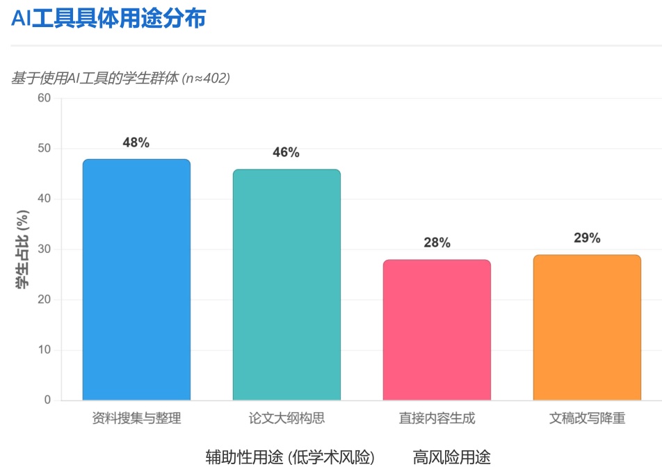 研究调查显示,超85%受访学生曾使用AI工具辅助学习。其中,近半数学生将其用于资料搜集整理、论文大纲构思等辅助性学习环节,体现出多数学生对AI工具的合理应用认知[7]。约30%学生存在风险行为,借助AI直接生成内容或改写文稿降重,反映该群体对AI时代学术不端的界定边界认知模糊,存在将技术手段凌驾于学术原创性要求之上的倾向。此差异揭示学生AI使用目的与学术不端认知存在显著关联,为高校完善AI时代学术诚信教育、明确工具使用规范提供了关键数据支撑。