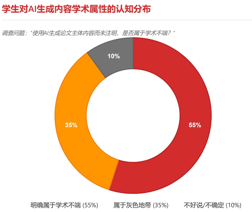 当被问及使用AI生成论文主体内容而未注明,是否属于学术不端时,仅有55%的学生明确认定为是,另有超过35%的学生认为属于灰色地带或取决于课程要求,还有10%的学生认为不好说,如图2所示。深度访谈进一步揭示,许多学生持“工具无罪”的功利主义态度,认为只要最终成果能通过考核,使用何种手段无关紧要。这种认知的模糊,直接源于高校缺乏明确统一的AI使用规范,使得学生在无意识中触犯伦理红线。