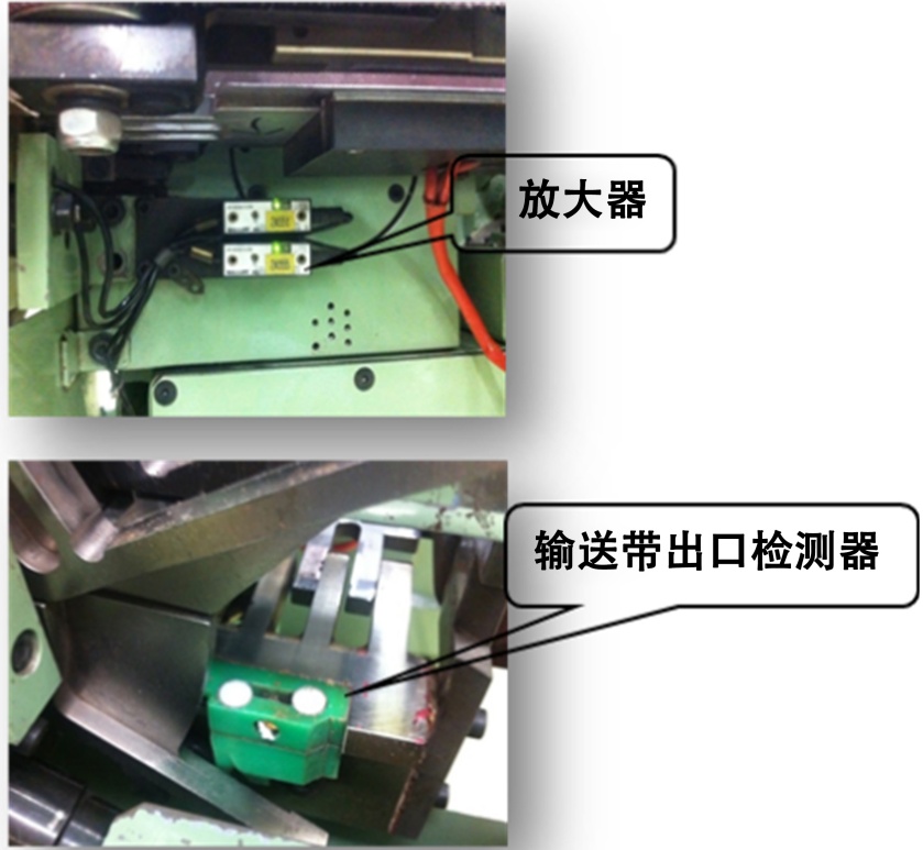 在排除其他夹烟原因后,检查烟包输送带补偿机构工作是否正常,烟包在输送带通道中包数68~70包之间,大多数设定为69包,烟包在输送带出口存在时,两个检测器相位是239˚~259˚之间,两个检测器分别检测烟包侧面的前端和后端,该检测器控制补偿电机工作。工作原理是在机器相位239˚~259˚之间时,如果检测器未检测到烟包时,补偿电机带动内齿轮变速机构加速,反之如果在该相位区间提前检测到烟包时补偿电机带动内齿轮变速机构减速,使烟包输送带正确传送烟包到位。如图4所示。
