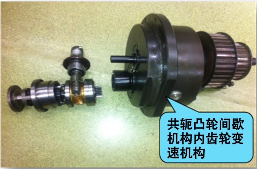 烟包输送带传动故障除了主要由内齿轮变速机构导致外,共轭凸轮间歇机构故障也是一个重要原因。烟包输送传动带是由共轭凸轮间歇机构–内齿轮变速机构–蜗杆蜗轮–牙嵌式离合器–齿轮轴–齿轮–主动带轮组成。通常出现故障的是共轭凸轮间歇机构,如图8所示。