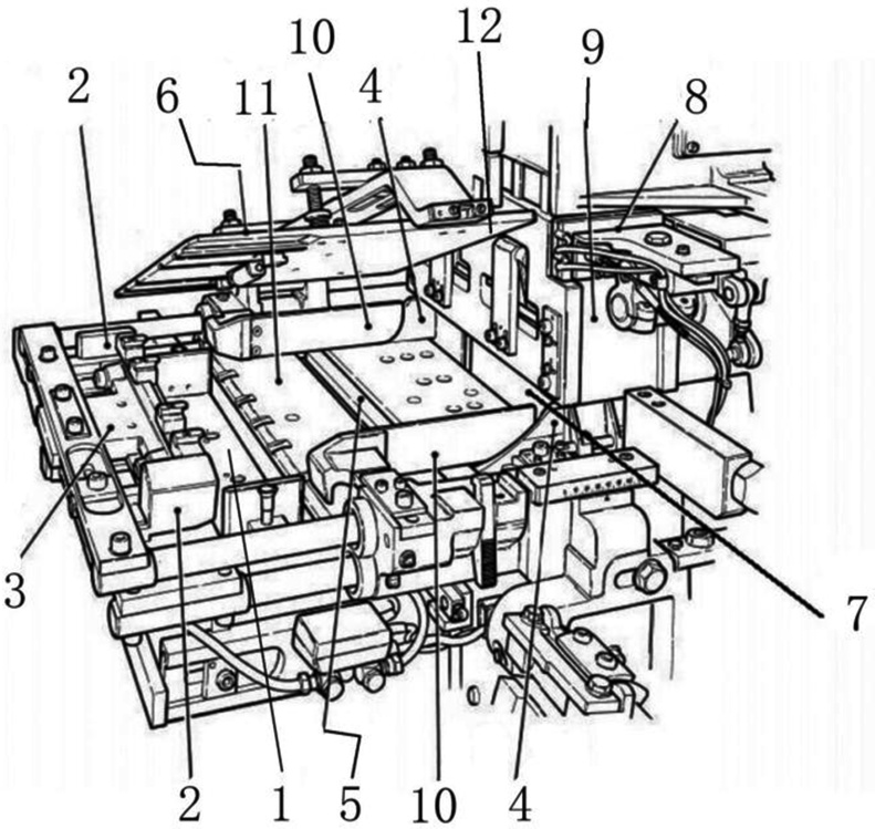 1-第一提升器;2-活动折角器;3-推送器;4-螺旋线板;5-长边烙铁;6-反衬件;7-二提升器;8-出口烙铁;9-封口位置侧壁;10-固定折角器;11-条盒底板;12-上压板。