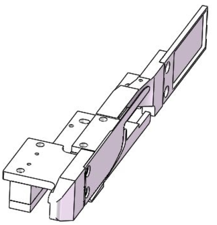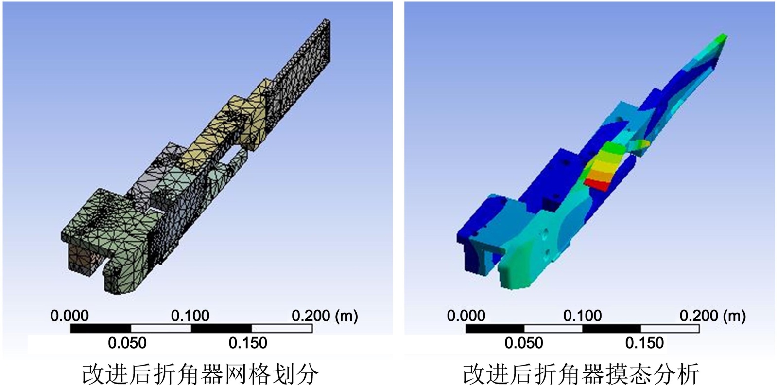 对改进后折角器建立模型,运用ANSYS进行模态仿真时,模型的建立有两种方法。一种是运用SolidWorks软件完成三维模型的建立,然后将模型转换为stp格式导入ANSYS软件。另外一种是直接在ANSYS经典GUI界面中建立三维模。本文选择运用SolidWorks软件建立三维模型[7],如图4所示。