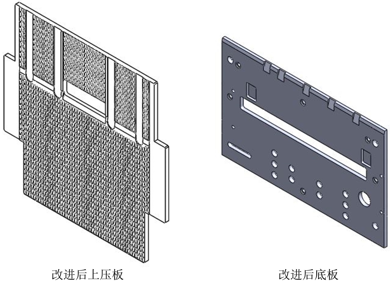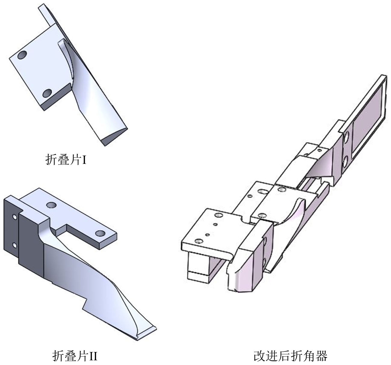 改进后折角器主要由折叠片I和折叠片II组成,折叠片I曲面角度由下水平0˚逐步变化为90˚完成下折角的折叠,折叠片II的曲面角度由上水平0˚逐步变化为90˚完成上折角的折叠。相比于改进前,改进后的折角器增加了折叠片II,在水平通道上既下折角的折叠,同时也完成了上折角的折叠(图6)。