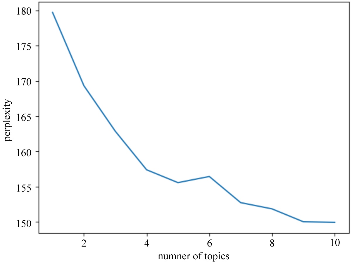 本研究采用Python中的Scikit-Learn包实现LDA主题建模。研究者首先对数据进行了系统的文本预处理,随后使用CountVectorizer、TfidfVectorizer构建词频矩阵与TF-IDF特征向量。在训练模型时,LDA主题模型要求分析人员预先设定主题数量。尽管可以通过困惑度和主题一致性等指标来评估模型的好坏从而确定最佳主题数,但是当主题数量过多时,模型可能已经过拟合。因此,本研究将主题数量分别设置为1~10构建主题模型,通过人工检查确定合适的主题数量。
