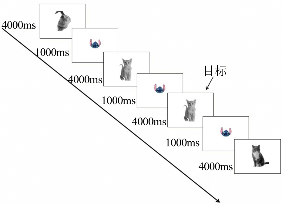 在n-back任务中包括三种刺激类型,社会性刺激(面孔:男,女)、限制性兴趣刺激(动物:猫,狗)和非限制性兴趣刺激(乐器:提琴,吉他)。三种刺激类型在呈现方式、大小和呈现时间上保持一致。任务使用E-Prime软件编程,屏幕背景为白色,图片刺激呈现在屏幕中央。实验设置两种难度水平:1-back和2-back。1-back要求被试比较当前刺激和上一个刺激是否相同(如图1);2-back要求被试比较当前刺激和上个刺激是否相同。在两种叠加层条件下(有/无颜色叠加层)都实施了1-back和2-back任务,每种任务难度下包含60个试次。