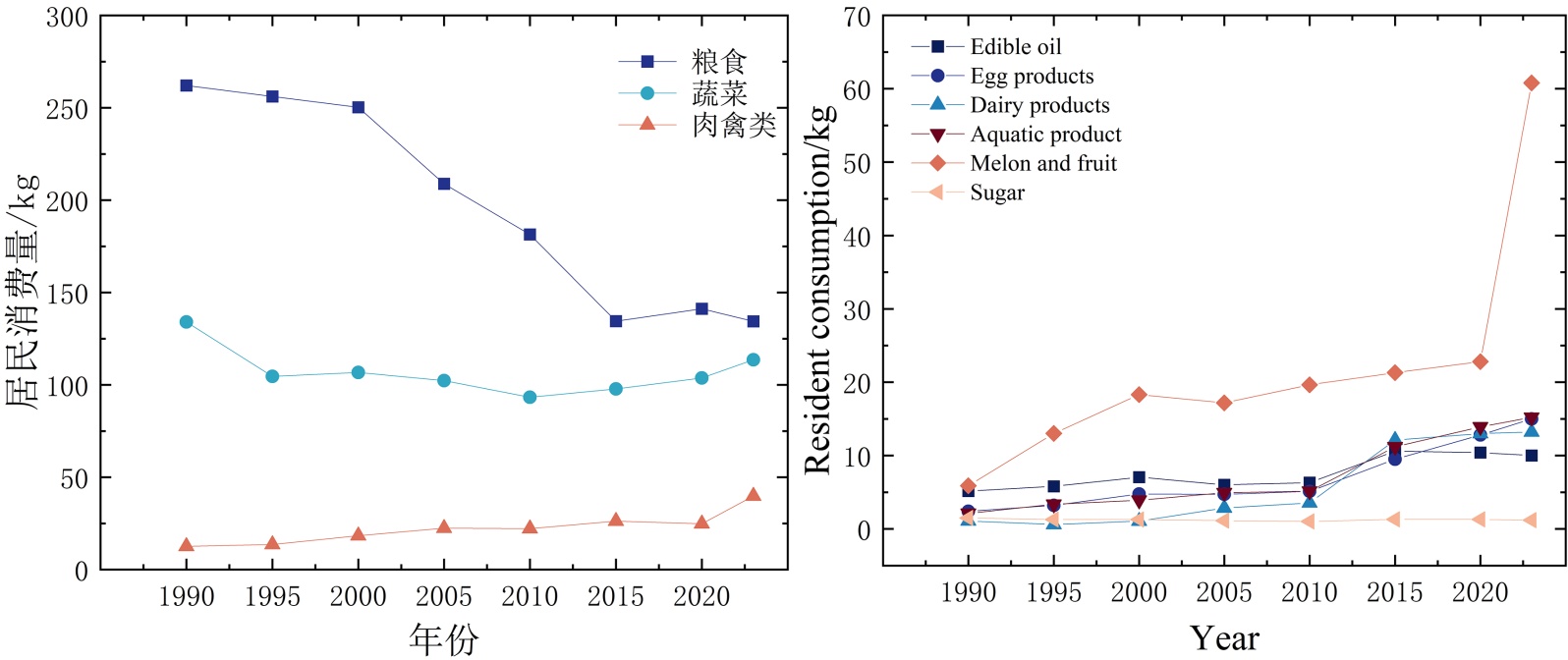 近30年来,中国的膳食结构出现了显著的变化(如图1)。从中国统计年鉴中所统计的10种中国居民主要消费的食品类别看,1990年,我国粮食(原粮)消费为262.05 kg/人,2023年为134.4 kg/人。粮食消费呈现下降趋势。1990年中国食用油消费为5.17 kg/人,2023年为10.0 kg/人,增长约一倍。中国主要肉禽类食品的人均消费量在1990年仅为12.59 kg/人,蛋类及相关制品为2.41 kg/人,2023年全国的肉禽类消费则达到52.2 kg/人,消费量增幅约415%,蛋类及相关制品为15 kg/人,增幅约5倍。可见中国动物性食品增长幅度较大。中国奶类食品消费1990年仅为1.1 kg/人,即使2023年中国奶类食品消费增长幅度超过10倍,也仅为13.2 kg/人。中国膳食指南2022推荐我国居民的奶类食品每日摄入量约为300 ml以上的液态奶,约109.5 kg/人。可见中国居民的奶类消费远远不足。中国人均蔬菜消费量1990年为134 kg/人,2023为113.6 kg/人,蔬菜的消费量出现小幅下降。瓜果类消费1990年为5.89 kg/人,2023年为60.8 kg/人,在30年里增长了约10倍。水产品消费量在1990年为2.13 kg/人,2023年达到15.2 kg/人,涨幅约10倍。中国食糖消费量1990年为1.5 kg/人,2023年为1.2 kg/人,消费量较稳定。