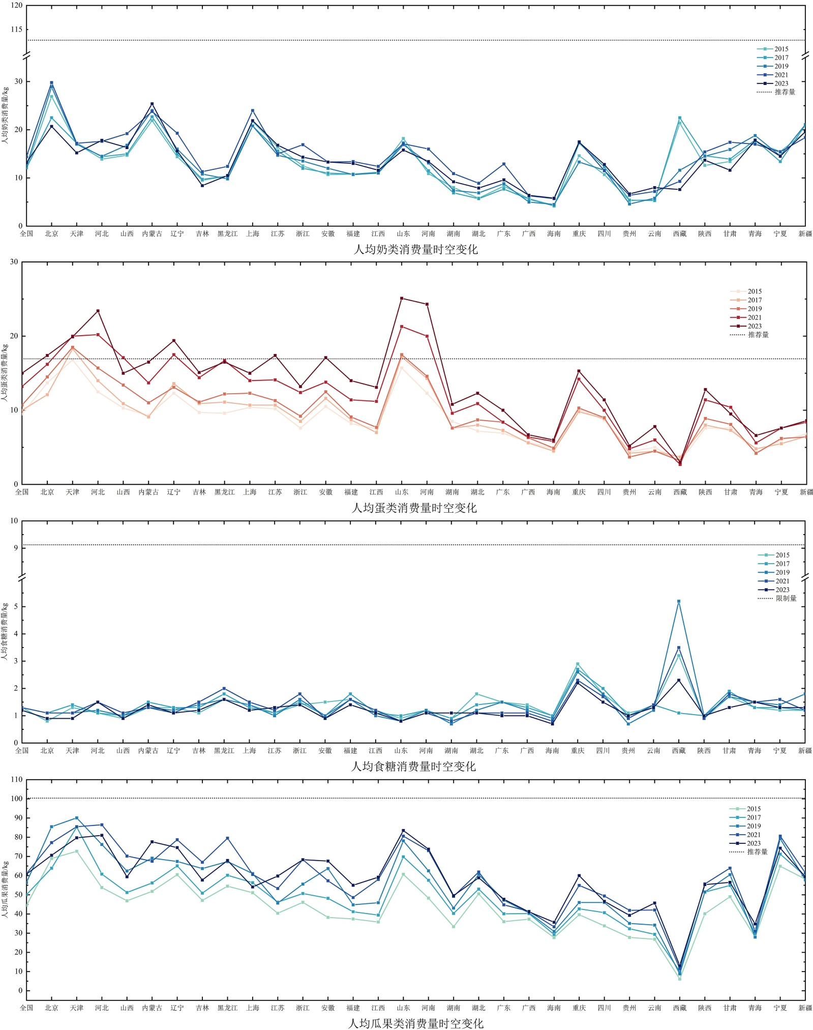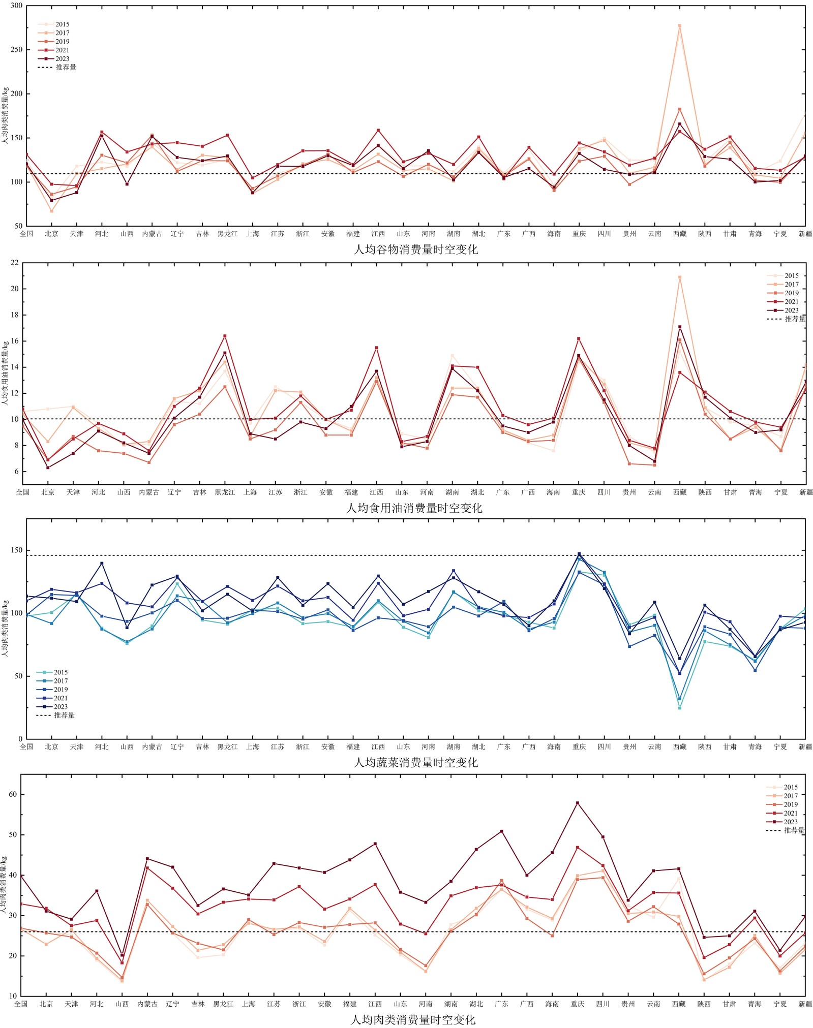 31个省级行政区的饮食变化特点各不相同。如图2所示,西藏地区的人均谷物消费远超全国其他地区,2015年为历史最高达到了269.6 kg/人,此后逐年下降,2023年为166 kg/人。北京地区谷物消费为全国最低,2023年为79.2 kg/人。31个省级行政区食用油的居民消费量差异不大,云南低于中国其他地区,2023年为6.8 kg/人。西藏自治区在2023年食用油消费量达到17.1 kg/人,为全国最高。31个省级行政区的人均肉类消费都呈现增长趋势,山西省的人均肉类消费最低,2023年为20.2 kg/人。重庆市的肉类食品消费在2023年远超其他省级行政区,达到了57.9 kg/人。2023年我国各省级行政区的肉类食品消费仅山西(20.2 kg/人)、陕西(24.6 kg/人)、甘肃(25.0 kg/人)、宁夏(21.4 kg/人)低于中国居民膳食指南的肉类消费推荐值(26.07 kg/人),其余省级行政区的肉禽类消费量均超过推荐值。各省级行政区蔬菜的人均消费量变化较小,重庆市的蔬菜消费量在2023年为146.4 kg/人,消费量为全国最高。重庆市在2023年的蔬菜消费量达到了中国居民膳食指南的蔬菜消费推荐值(146 kg/人)。奶类食品的消费量总体偏低,北京市在2023年的奶类食品消费量达到20.7 kg/人,虽然北京市为全国奶类食品的最高人均消费量,但任然远低于膳食指南的推荐量(109.5 kg/人)。山东省的蛋类食品消费量最高,为25.1 kg/人。中国居民水产品的消费量则呈现明显的地域划分,沿海地区水产品消费量较高,内陆地区的水产品消费量则较低。海南省是全国水产品消费量最高的省份,2023年达到了33.5 kg/人。山东省在2023年瓜果消费量最高为83.5 kg/人。食糖类消费在31个省级行政区中无显著差异。