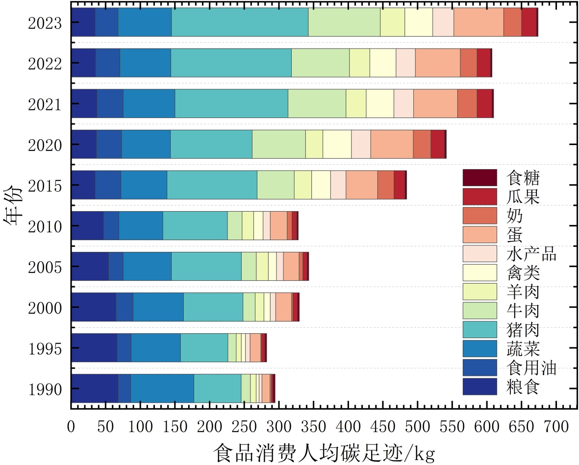 1990年至2023年间,中国居民食物消费的碳足迹总量从26.5千万吨增至66.2千万吨,其中动物性食品的碳排放量占比从1990年的43.8%升至2023年的78.7%。重庆市、西藏自治区和广东省的人均碳排放量最高,分别为625.19 kg/人、585.14 kg/人和576.61 kg/人。