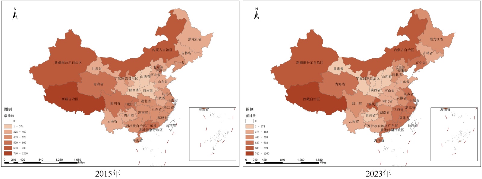 如图5所示,总体而言,我国各地区碳排放总量均呈现上升趋势,其中从2023年人均食品消费碳足迹的绝对水平看,高值地区主要集中于西部和部分直辖市及资源型地区。