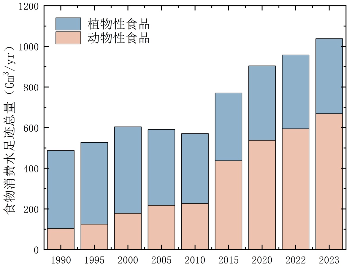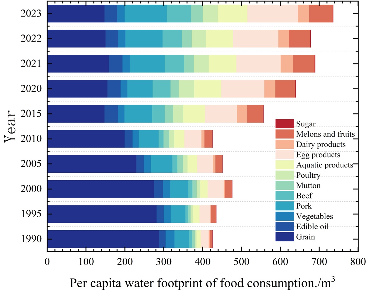 1990年至2023年间,中国居民食物消费的水足迹总量从48.7千万吨增至103.8千万吨,其中动物性食品的水足迹占比从1990年的21.4%升至2023年的64.4%。西藏自治区的人均水足迹最高,为978.75 kg/人。