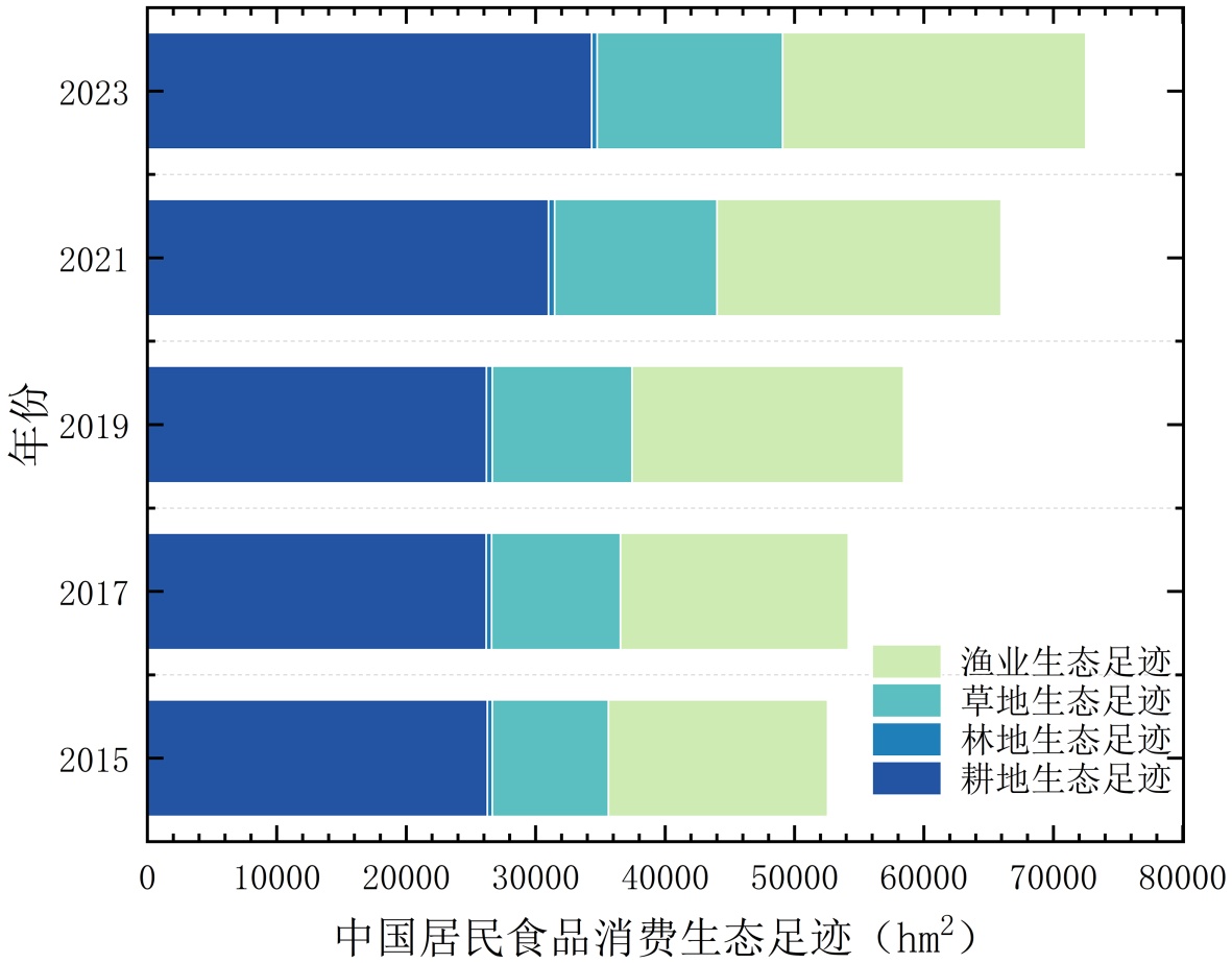 生态足迹:2015年至2023年间,中国居民人均食品生态足迹从0.39 hm2/人/年增至0.53 hm2/人/年,涨幅达35.9%。动物性食品对生态足迹的贡献最大,尤其是猪肉和水产品。2023年,猪肉和水产品的生态足迹占比分别为32.69%和32.32%。由于肉禽蛋奶和水产品消费量的急剧增加,草地和渔业已经出现生态资源压力较大,耕地和林地虽然目前还处于生态盈余状态,但也面临生态承载力不断下降的风险。需要根据不同地区的经济发展水平、饮食习惯和自然资源条件,引导居民合理膳食,增加植物性食品和奶类食品的消费,减少动物性食品的消费[36]。