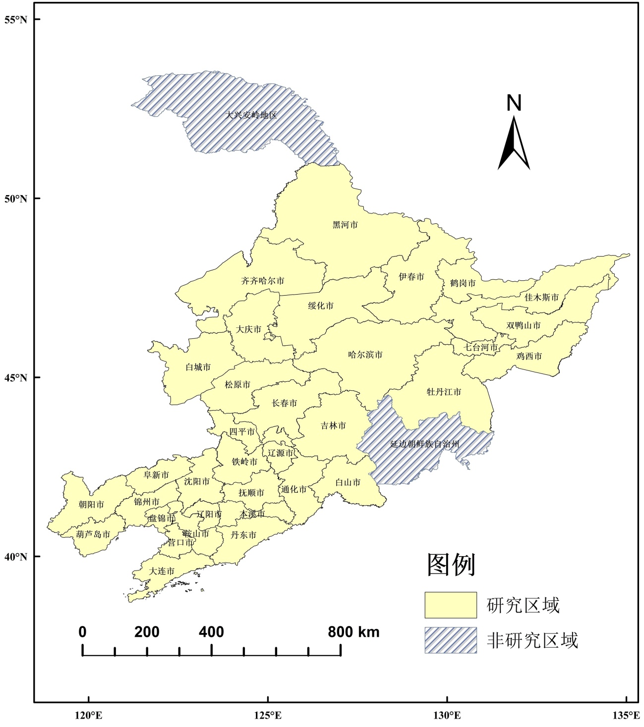 东北三省位于中国的东北部,包含了黑龙江省、吉林省和辽宁省,下辖34个地级市、1个大兴安岭自治区、1个延边朝鲜族自治州。本研究选择34个地级及以上城市为研究区域,由于数据缺失,剔除大兴安岭自治区和延边朝鲜族自治州(图1)。数字经济和技术创新是应对内外部冲击对经济造成的负面影响,影响我国经济韧性强弱的关键因素。东北三省作为数字经济发展的潜力提升地区,数字经济已然成为东北三省经济发展的重要影响因素。但是,东北三省目前还存在数字基础设施不完善、产业数字化转型滞后以及数字创新能力不足等问题,这些将显著制约经济发展。基于此,探究东北三省数字经济、技术创新对经济韧性时空演变分析,探寻现存发展模式中存在的问题,对于重振东北三省经济发展活力具有重要意义。