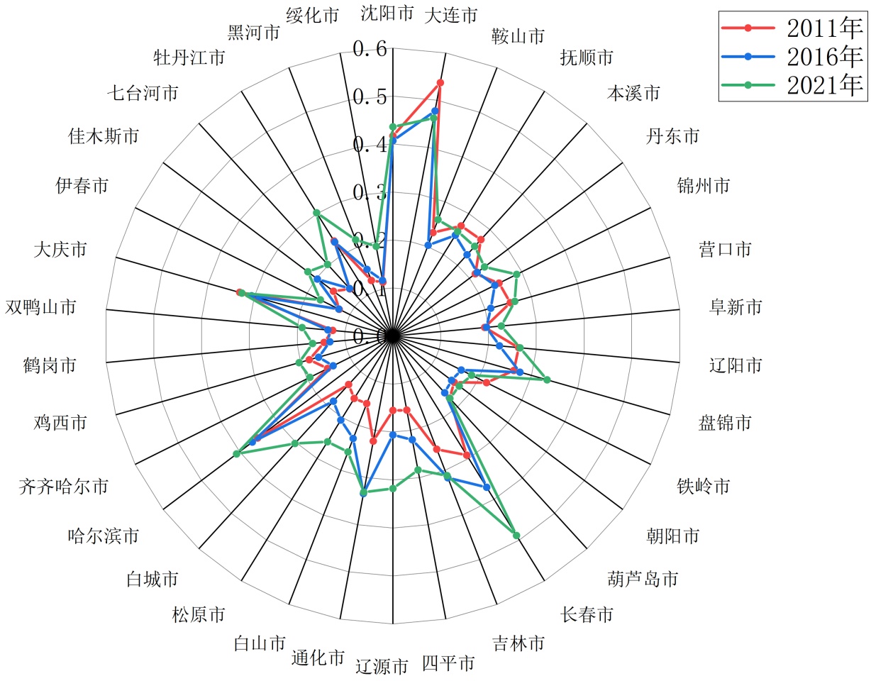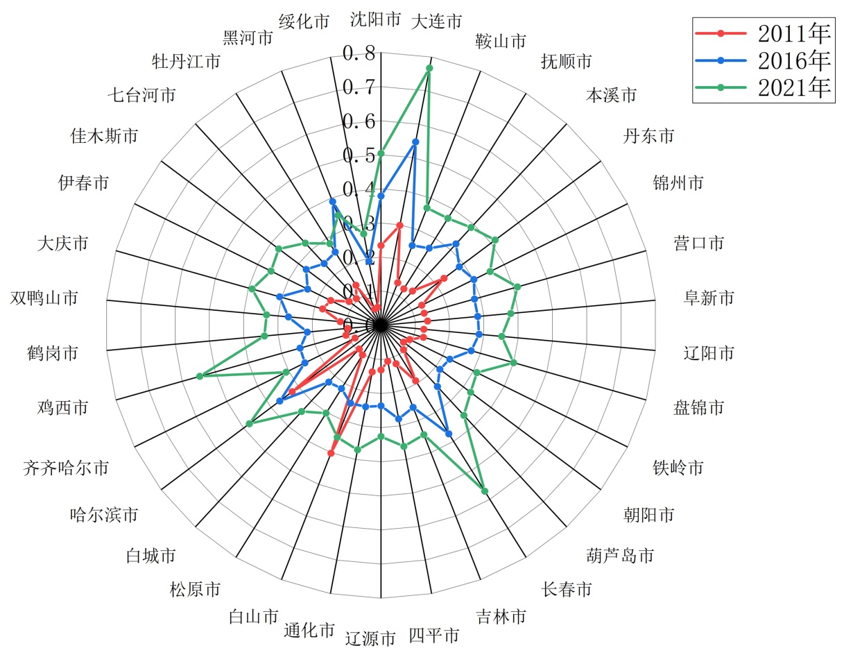 图6. 2011~2021年东北三省技术创新发展水平雷达图