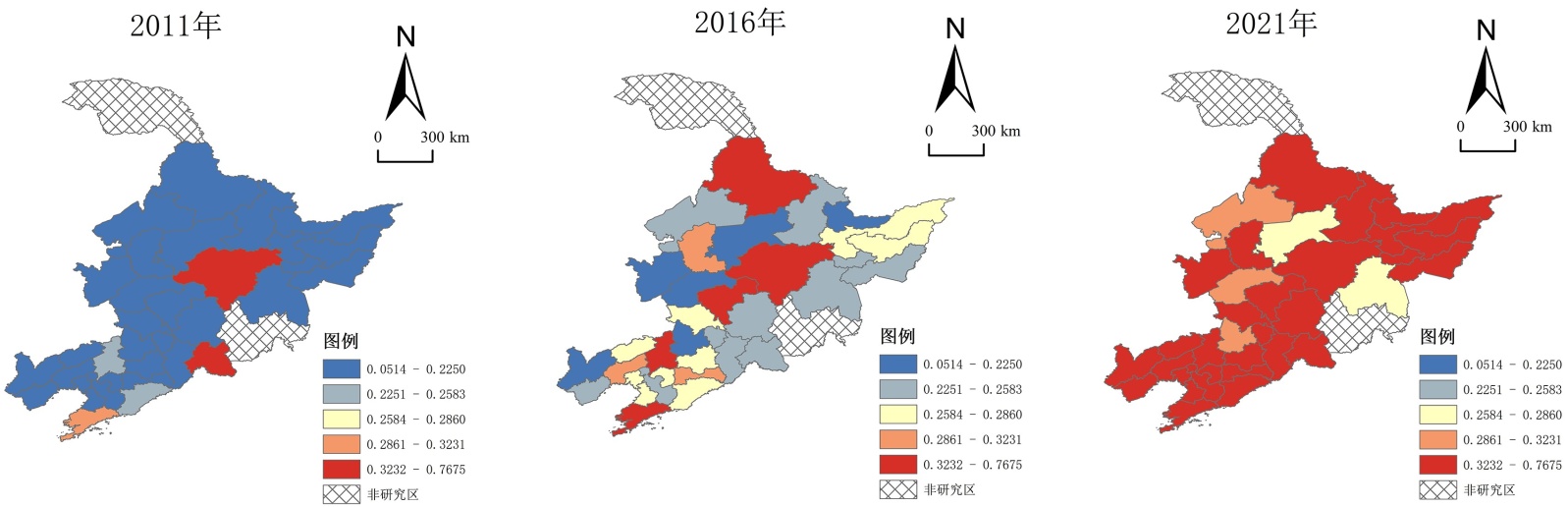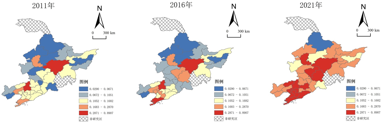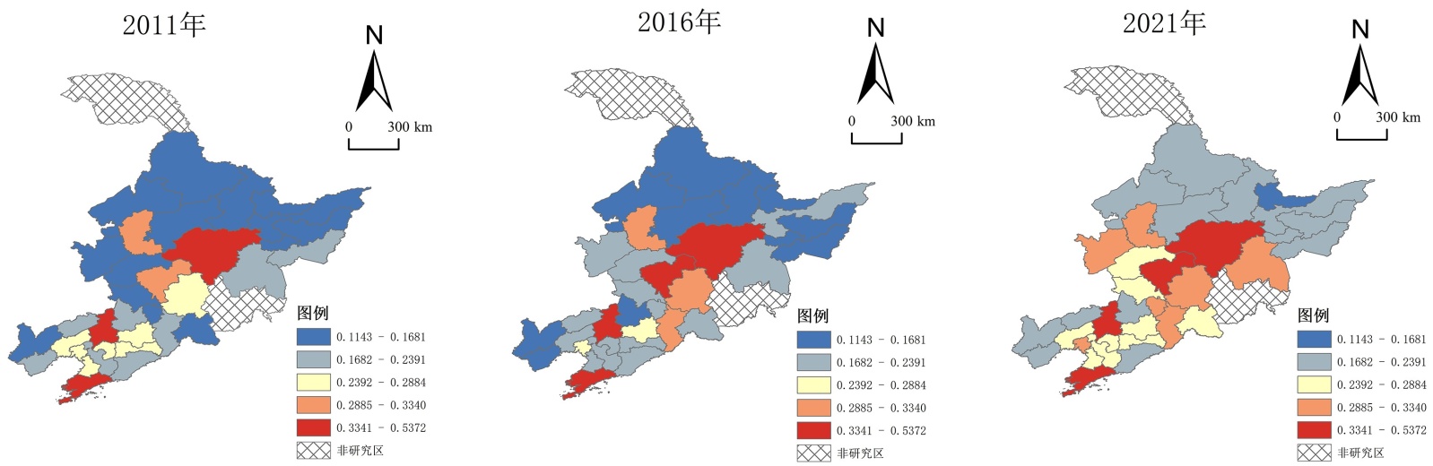 图5. 2011~2021年东北三省技术创新发展水平分布图