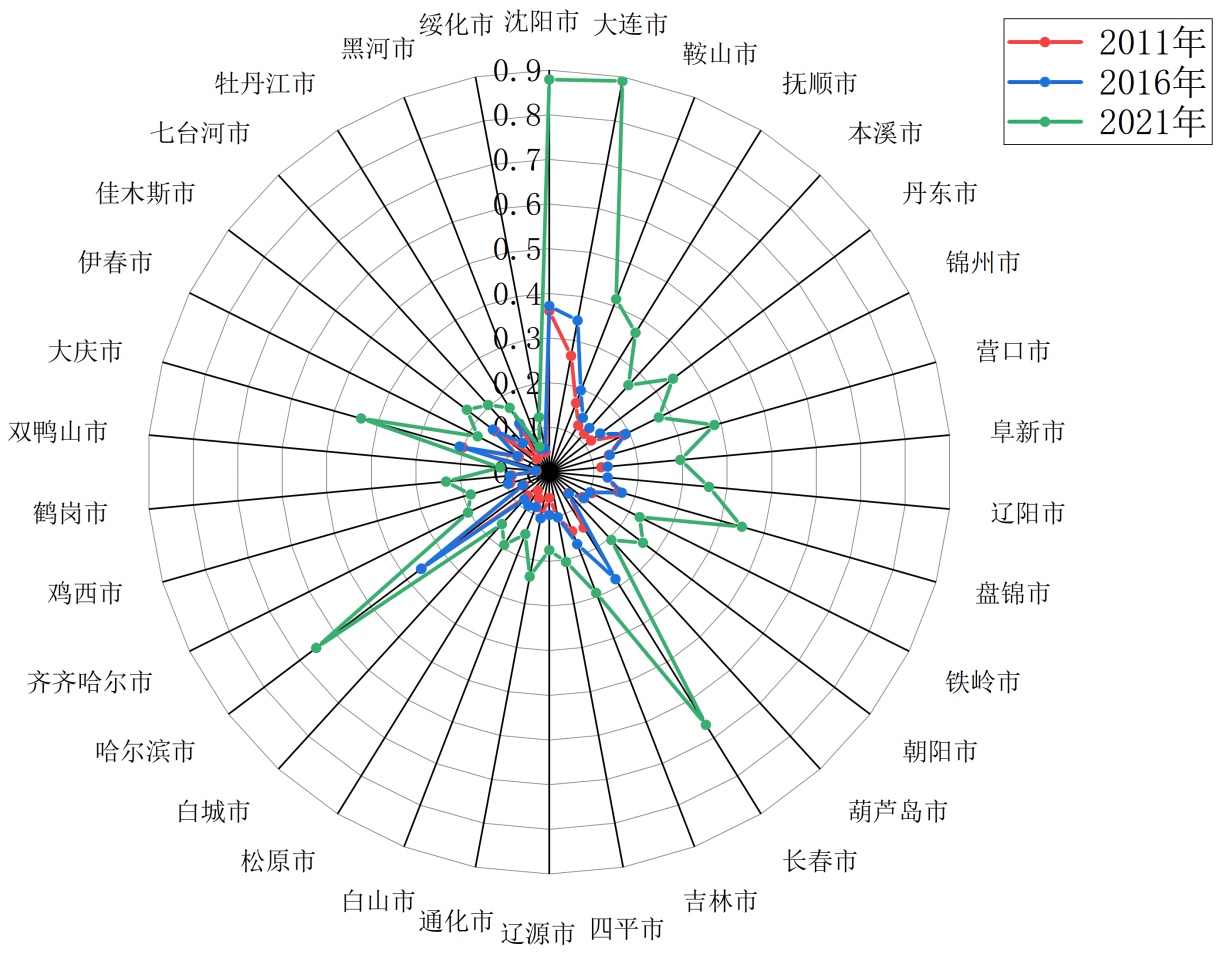 技术创新发展水平分布图图形左右基本对称(图5),总体来看,数据接近正态分布,不同组的中位数位置差异大说明组间中心趋势差异明显,总体离散程度呈现波动变化趋势。具体来看,分布形态在2011~2014年,图形宽度大,高度低,数据集中底部,说明整体水平低,城市间差异相对小;在2015~2017年形状逐渐拉长,开始出现向上延伸,少数城市开始突破;在2018~2019年图形上端开始拓宽;在2020~2021年图形中间宽,两头渐窄,说明中等水平城市增多,分布趋于集中。从离散程度看2011~2014年离散度较大,虽然绝对水平低,但相对差异明显;2015~2019年离散度先增后减;2018年差异最大可能是由于领先城市技术创新水平提升导致的;2020~2021年离散度稳定,差异格局基本形成。图6雷达图反映了2011年、2016年、2021年三个时间节点东北三省城市技术创新发展水平。总体来看2011~2021年间,东北三省各城市技术创新发展水平普遍提升,2016~2021年扩展幅度大于2011~2016年。从城市来看,研究期间东北三省城市技术创新发展水平均值差异较大。从2011年的0.123上升到2021年的0.308,增长率为150.41%;从各城市的均值来看,2021年各城市的数字经济发展水平均大于均值;超过0.300的城市有四个,分别为沈阳市、大连市、哈尔滨市、长春市。综合指数排名前三位的城市为沈阳市(0.481)、大连市(0.450)、哈尔滨市(0.410),沈阳市具有较好的技术创新生态环境和高端装备制造集群;大连市除具有特色产业集群外还有沿海开放门户优势;哈尔滨市具有科教资源富集优势,高等教育资源丰富,科研机构密集。排名后三位的城市为绥化市(0.071)、黑河市(0.058)、双鸭山市(0.038),三个城市技术创新发展水平均低于排名最高的沈阳市的数字经济发展水平的一半,这可能是由于三个城市均创新需求不足引起。
