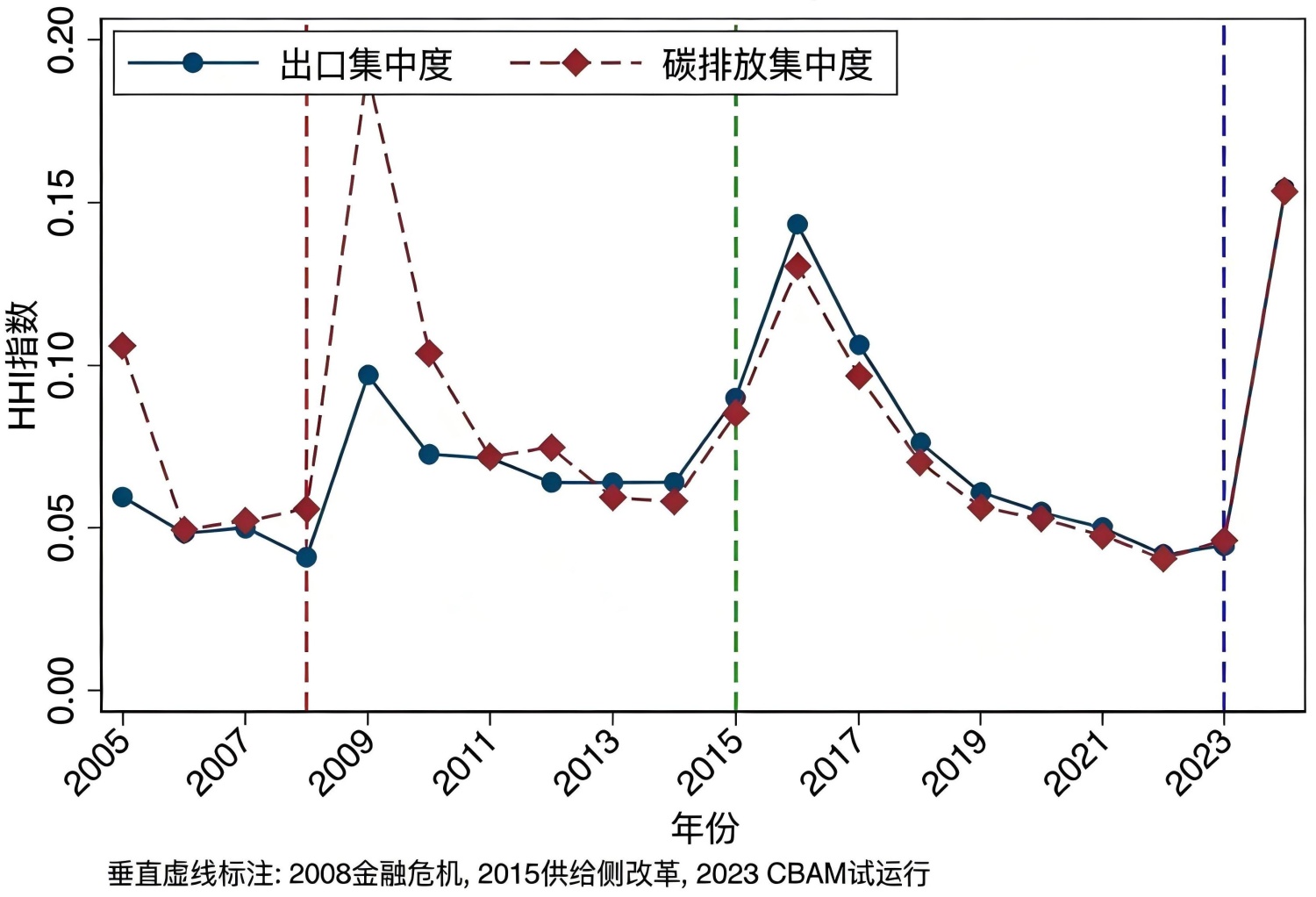 该阶段产品组合较为固定,高碳钢材出口占比长期居高,总体HHI曲线维持在相对高位。受金融危机外需冲击影响,2008年组间HHI曲线出现快速抬升,体现了危机情境下出口结构的“惯性集中”特征。