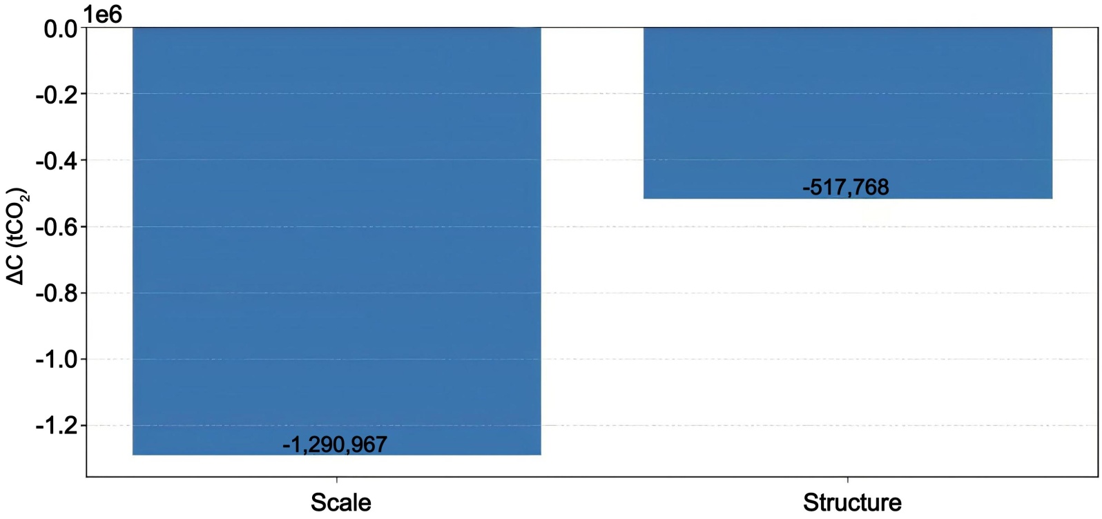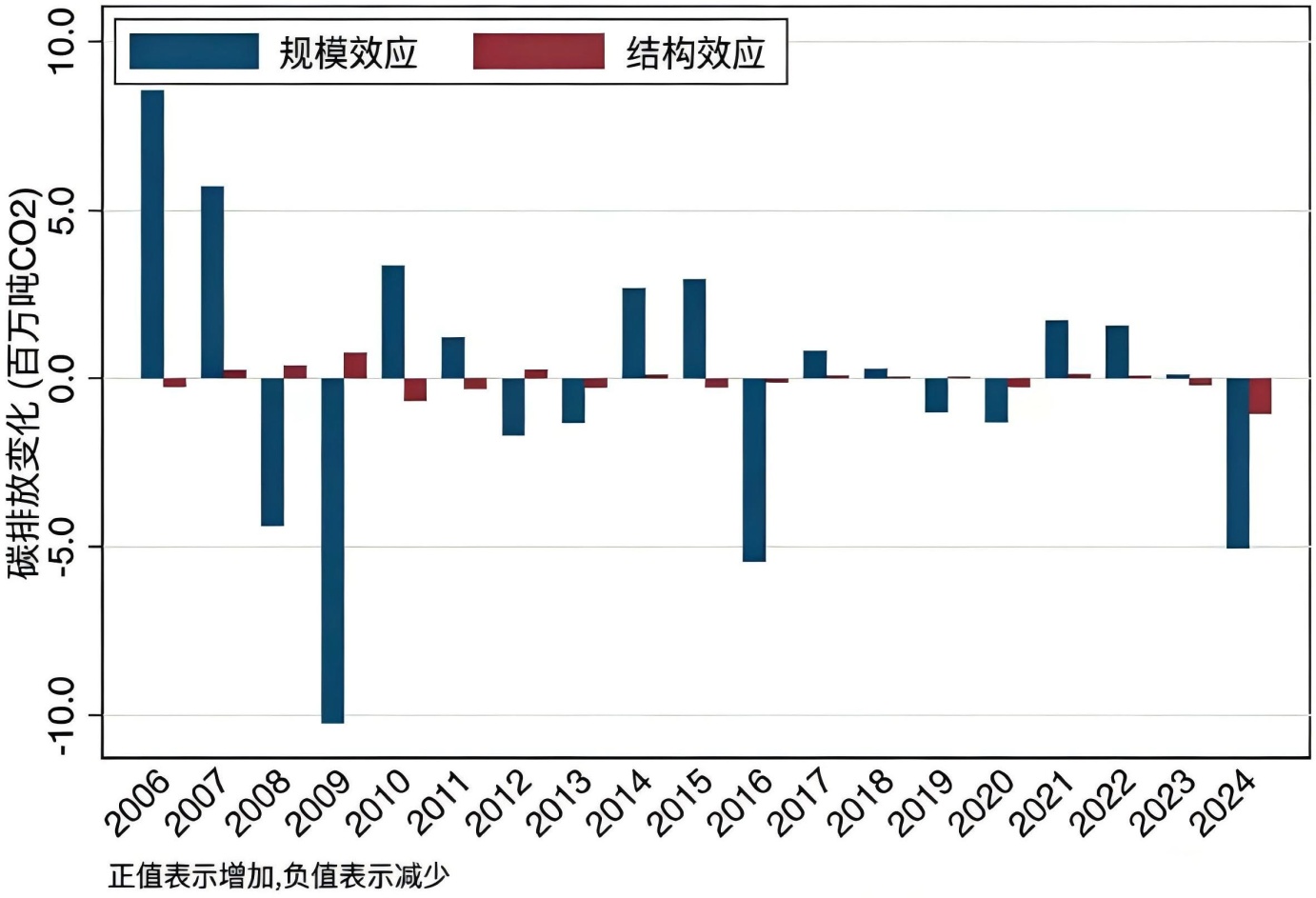在前文出口加权碳强度趋势分析的基础上,为进一步揭示中国对欧盟钢铁出口隐含碳排放变化的驱动机制,本文利用LMDI模型对2005~2024年间的隐含碳变化进行首尾年分解,将其拆解为规模效应(出口总量变化对隐含碳的影响)与结构效应(即不同碳强度产品占比的变化对隐含碳的影响)两类因素。前者反映出口总量变化对隐含碳排放的影响,后者体现出口结构优化对排放水平的贡献。该分解有助于区分“量变”与“质变”在低碳转型中的相对作用,为判断中国钢铁出口减碳的内在逻辑提供一定得依据。