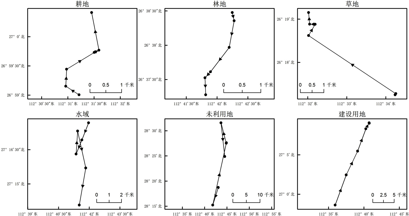 (1) 数量结构上,湖南省湘江流域耕地呈持续减少态势,23年间净减少1748.47 km2,建设用地则显著增加,累计净增长1666.08 km2,林地面积占比稳定,草地则因持续减少,面积占比逐渐被建设用地超越。空间结构与转移特征上,各土地利用类型重心迁移差异显著。耕地重心整体北移且波动明显,林地重心向研究区西南方向缓慢迁移,建设用地先东北后南移,反映扩张区域由下游向中上游转移;转移特征以耕地转出为主,主要转向建设用地与林地。