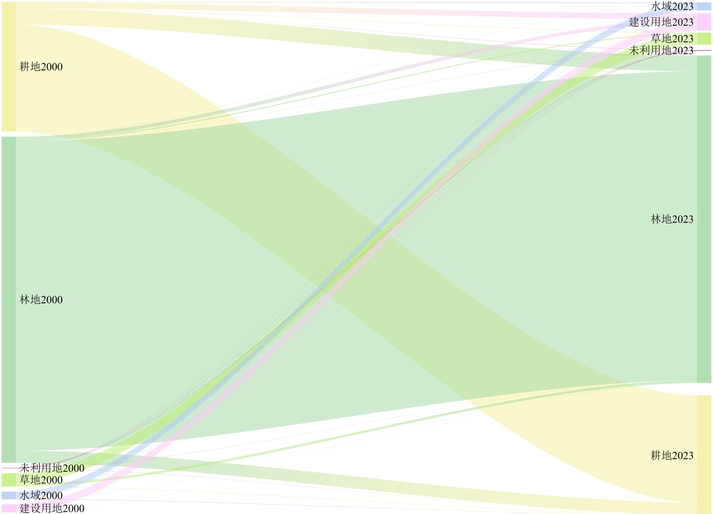 利用ArcGIS 10.8软件中的重分类工具,对各地类面积进行统计,得到各土地利用类型面积及其占比情况(表2)。由表2可知,2000年至2023年间,湘江流域土地利用结构变化显著。林地和耕地始终为湘江流域的主要土地利用类型,其面积占比分别保持在67.24%和24.75%以上。其中,林地面积总体较为稳定,占比始终在67.44%上下浮动,耕地面积则呈持续下降趋势,其面积从2000年的23271.27 km2降至2023年的21522.80 km2,23年间净减少1748.47 km2。草地在初期为湘江流域第三大土地利用类型,但因面积持续下降,其占比于2015年被建设用地超越。研究期内,湘江流域城镇化进程推进迅速,建设用地面积显著增加,由2000年的1417.11 km2增加至2023年的3083.19 km2,累计增长1666.08 km2,其面积占比也从1.63%提高至3.55%。