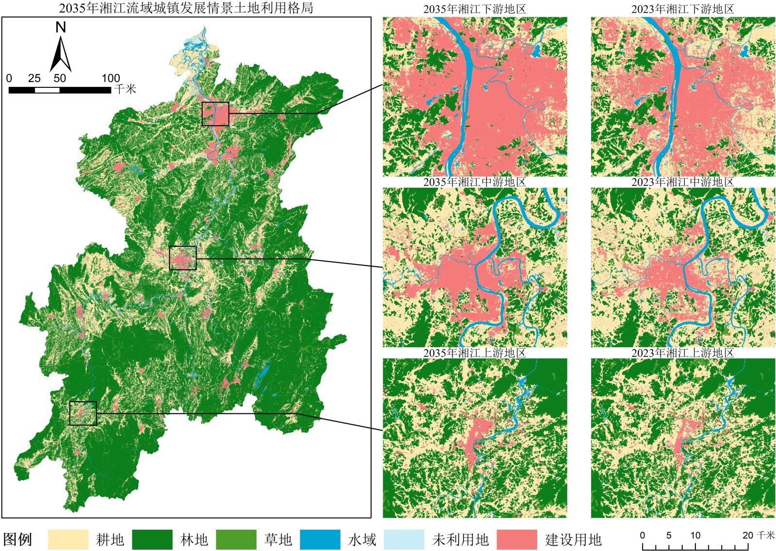 图4. 2035年自然发展情景湘江流域土地利用空间格局模拟与2023年实际对比图