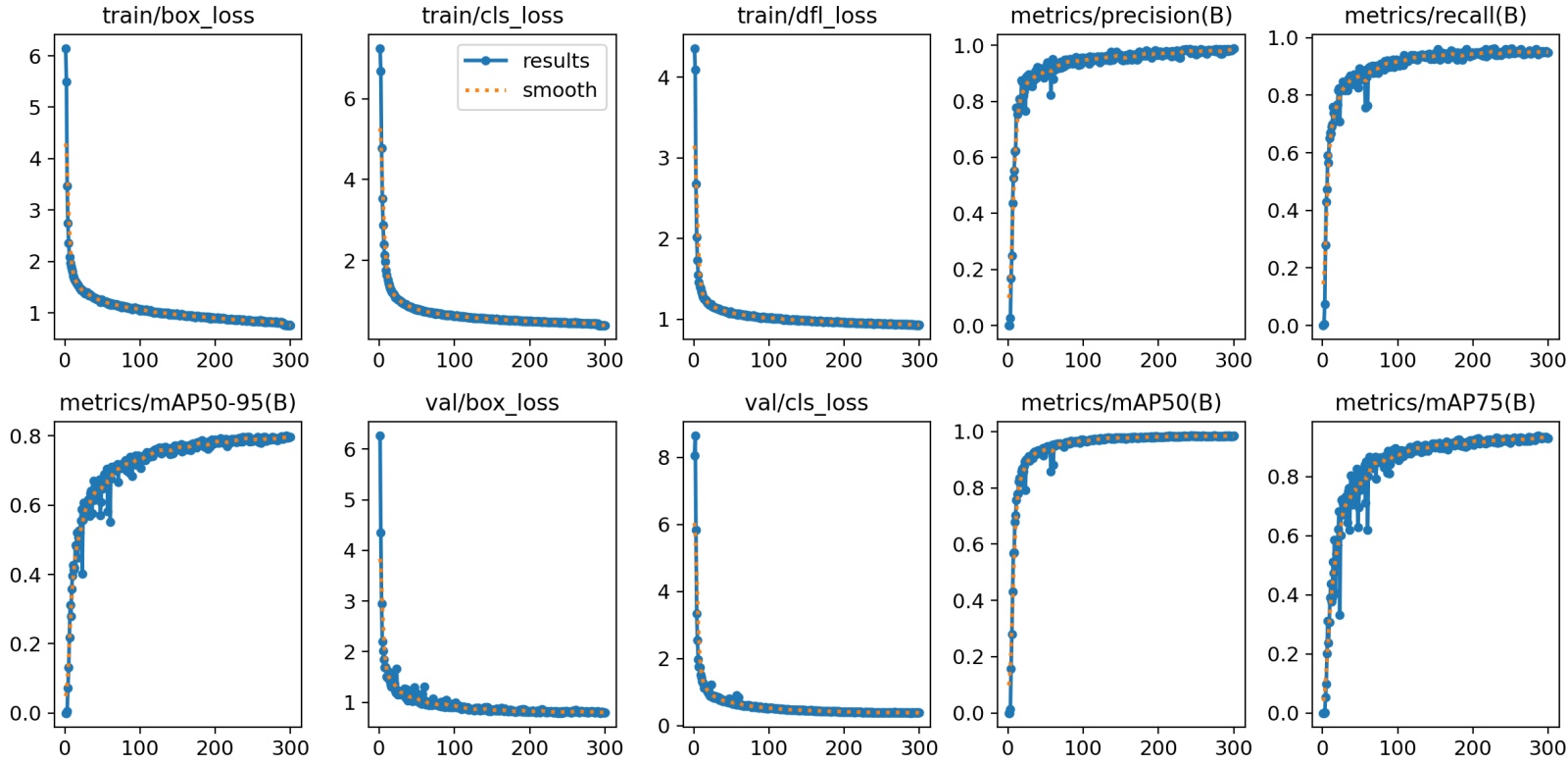 为清晰呈现YOLOv12模型在DeepPCB数据集上完成缺陷检测任务的训练进程及性能变化规律,本研究对损失函数、检测精度、召回率以及平均精度均值等核心评价指标展开全程监控与可视化分析,相关结果如图1所示。从训练损失变化曲线可见,边界框损失(train/box_loss)、类别损失(train/cls_loss)与分布焦点损失(train/dfl_loss)均从较高初始值快速回落,并逐渐趋于收敛平稳,这意味着模型对PCB缺陷的目标定位、类别判别以及边界框精细化回归能力得到持续优化。同时,验证集的边界框损失与类别损失变化趋势与训练集高度吻合,无显著偏离,佐证模型泛化性能优良,未出现过拟合问题。此外,检测精度(metrics/precision (B))与召回率(metrics/recall (B))均快速攀升并趋近于1,各类平均精度指标也趋于饱和,充分说明模型检测性能优异,已充分习得PCB缺陷的核心视觉特征。