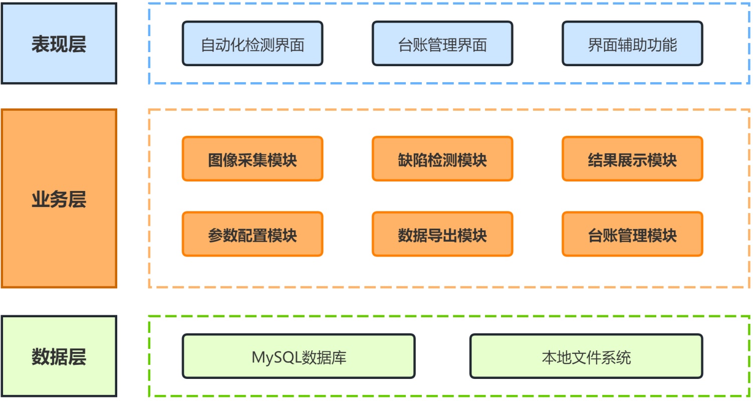 表现层包含自动化检测界面、台账管理界面、界面辅助功能。自动化检测界面布局分为五部分:左侧图像列表区、中间窗口PCB缺陷图像预览区、右侧检测详情表格区、下方左侧参数设置区、下方右侧检测数量统计区。台账管理界面布局分为三部分:上方查询区、中间缺陷台账表格区、下方详情编辑区。界面辅助功能为功能快捷键和分辨率自适应功能。
