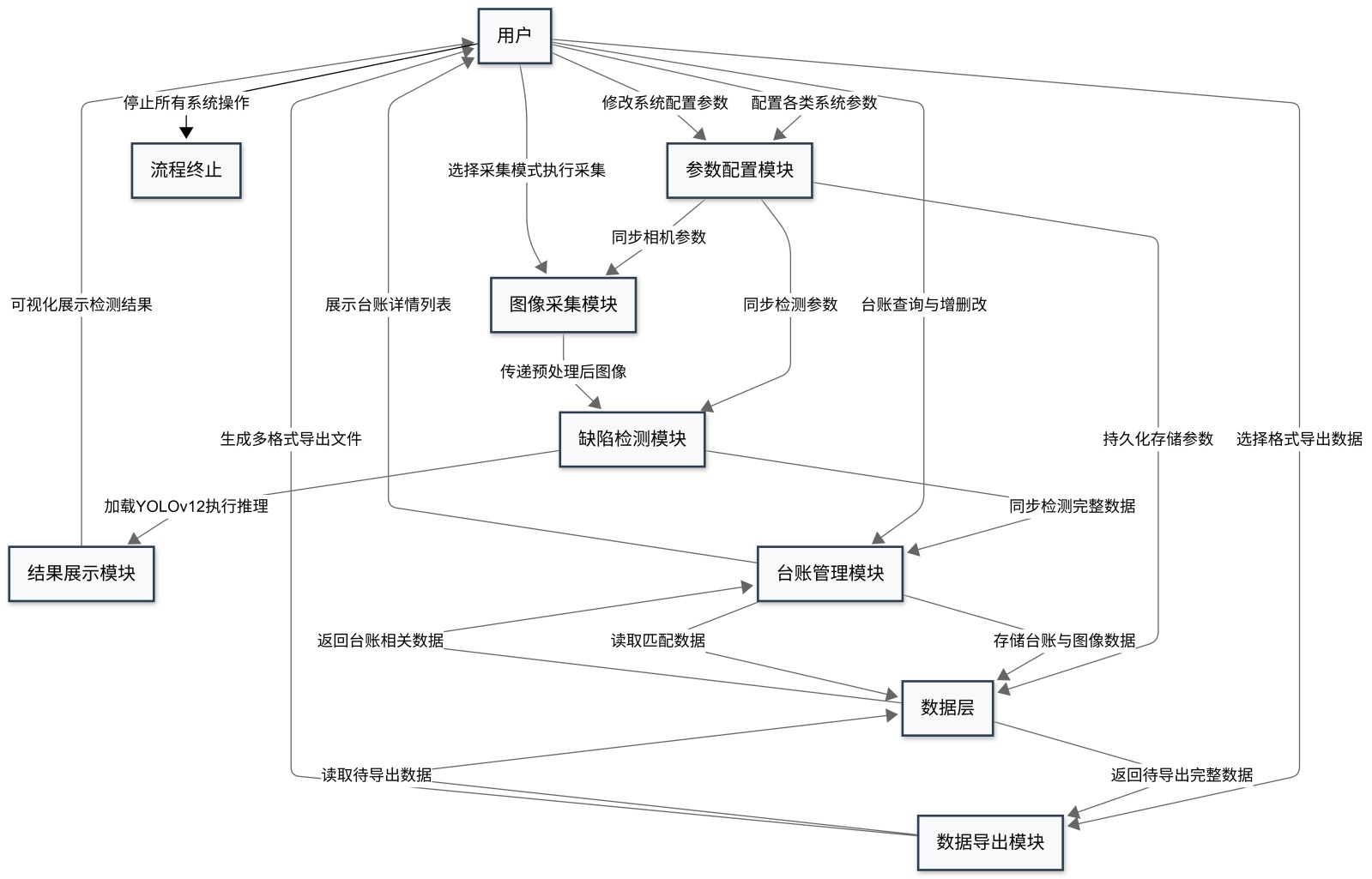 PCB缺陷检测系统各核心模块的交互闭环逻辑见图3,用户首先通过参数配置模块完成检测阈值、相机参数等设置,参数同步至相关功能模块并持久化存储至数据层;图像采集模块将采集的图像预处理后传递至缺陷检测模块;缺陷检测模块加载训练好的YOLOv12模型执行推理与后处理,检测结果同步至结果展示模块和台账管理模块;用户可对台账数据进行多条件查询、增删改操作,通过数据导出本地文件存储;各模块通过标准化接口交互,保障系统高效稳定运行。