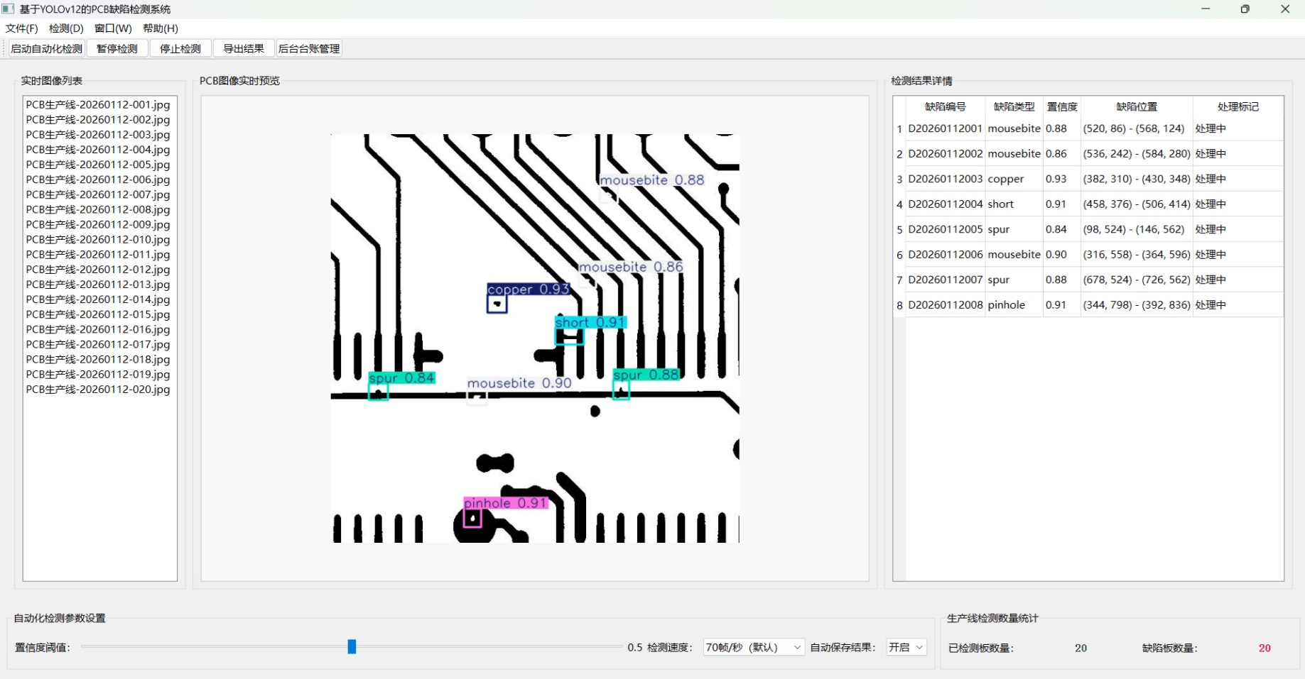 本研究围绕PCB缺陷工业检测的智能化需求,成功构建了基于YOLOv12深度学习模型与PyQt5可视化框架的PCB缺陷自动化检测系统,实现了从相机实时采集、缺陷精准识别、结果可视化展示到台账全生命周期管理的全流程闭环处理。系统通过置信度、帧率等核心参数的灵活配置,以及单条结果快速导出、批量台账完整归档的互补式数据导出功能,兼顾了现场检测的高效性与后台管理的规范性,有效降低了人工检测的主观误差与劳动成本,提升了PCB缺陷检测的精准度与可追溯性,具备良好的工业落地价值。但目前系统仍存在一定不足,如对极小尺寸缺陷的识别率有待提升,且暂未实现与MES制造执行系统的无缝对接。未来将进一步优化YOLOv12模型,通过数据增强、特征融合策略提升小缺陷识别能力,同时拓展系统功能,实现与工业产线其他系统的联动,推进系统的嵌入式部署与大规模工业化应用,为电子制造业质检环节的智能化升级提供更有力的技术支撑。
