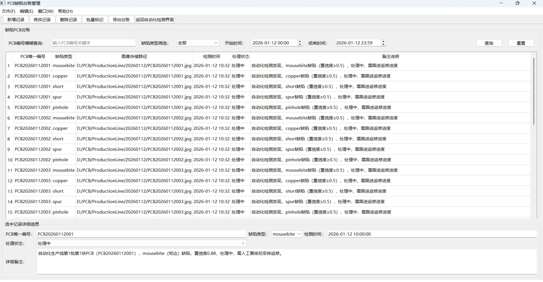 台账编辑功能支持单条记录增删改与批量删除操作,用户通过点击新增按钮弹出编辑窗口,输入PCB编号、选择生产批次等信息后,系统自动生成唯一台账记录;通过选中表格中的一条或多条记录,点击删除按钮可实现数据删除,删除前弹出确认提示,避免误操作;通过双击表格单元格或点击修改按钮可直接修改缺陷类型、处理状态等字段,备注栏支持多行文本输入,方便用户记录缺陷处理方案、原因分析等详细信息。所有编辑操作均会触发日志记录功能,系统自动记录修改人、修改时间、修改前值与修改后值,存储至操作日志表,支持用户后续追溯数据修改历史。