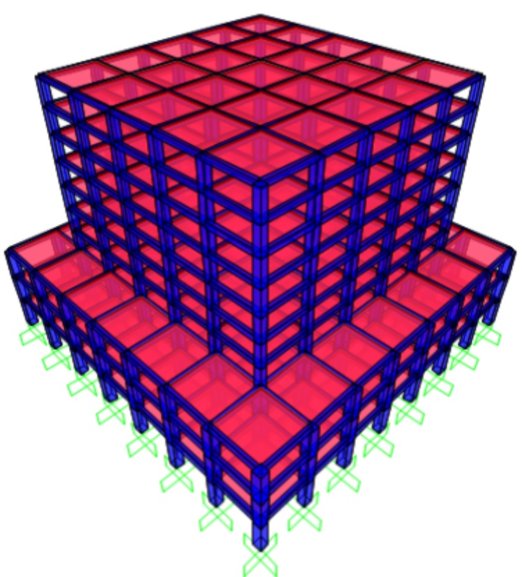 鉴于上述学者的研究成果,为研究楼板隔震TMD结构在建筑工程中减隔震性能,提升安全性和可靠性以及便于实际工程的应用。本文以一栋小高层商业办公综合楼为例如图1,利用非线性有限元软件SAP2000进行弹塑性时程分析,通过非线性FNA法分析楼板加速度、楼层位移,基础剪力、层间位移角等抗震性能参数。探讨不同楼板隔震方案对结构的影响,确定最优的减隔震方案,并分析结构在罕遇地震作用下的动态特性和响应,为后期指导工程实践提供有力支撑。