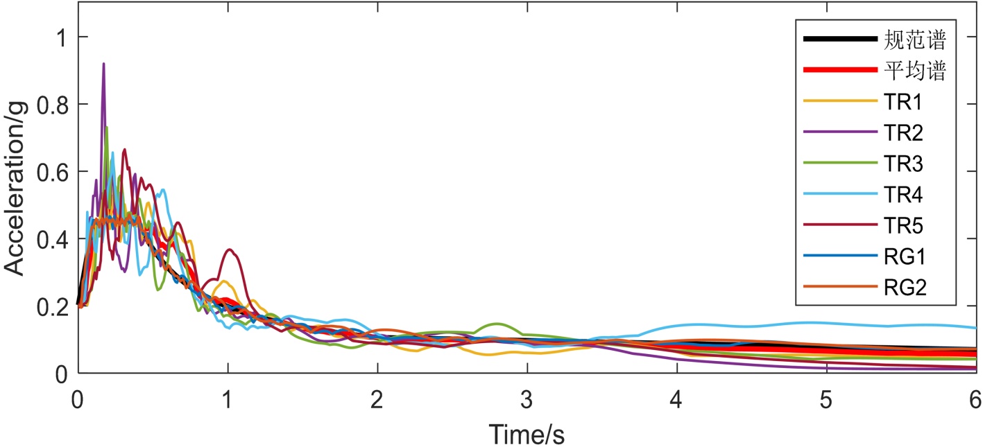 从太平洋地震工程研究中心(PEER)数据库中筛选出多条具有代表性的自然波,并通过GM-Tools软件进行处理,本工程实际选取了5条天然地震波和2条人工波,地震波编号为TR1-TR5和RG1-RG2,详见表2。将七条波进行归一化处理,峰值加速度调整至200 cm/s2,地震波反应谱曲线见图3。在进行罕遇地震下弹性时程分析时,再将地震波加速度峰值调整至400 cm/s2。以X方向对结构输入地震动进行数值模拟。
