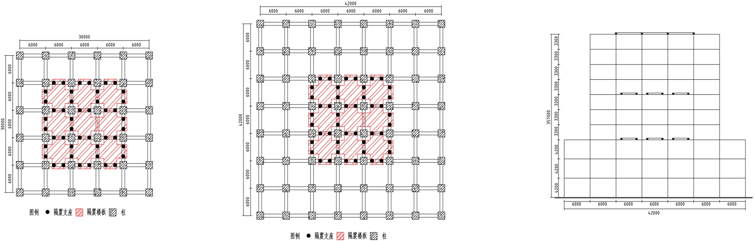 结合本次拟建的商业办公综合楼的结构特性以及场地条件,在保障结构安全下考虑节约造价成本问题,设计出楼板隔震TMD结构六个方案,分为两大类。顶层隔震楼板TMD结构布置,只在顶层设置楼板隔震层且支座放在柱上,按照楼板块数、排列方式的不同设计出三个方案置详见图4。