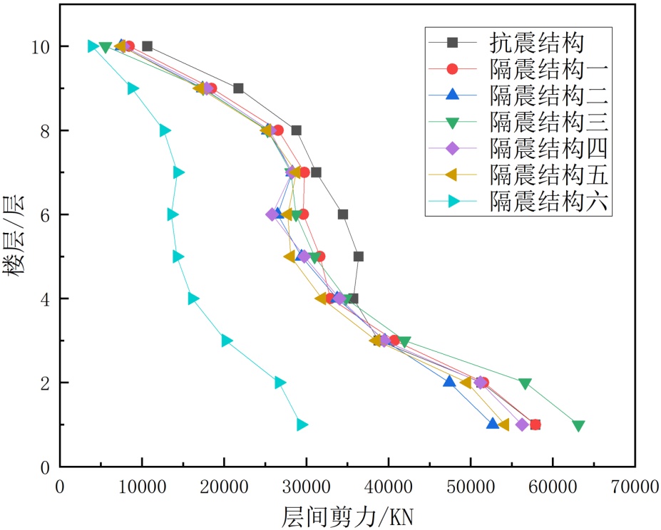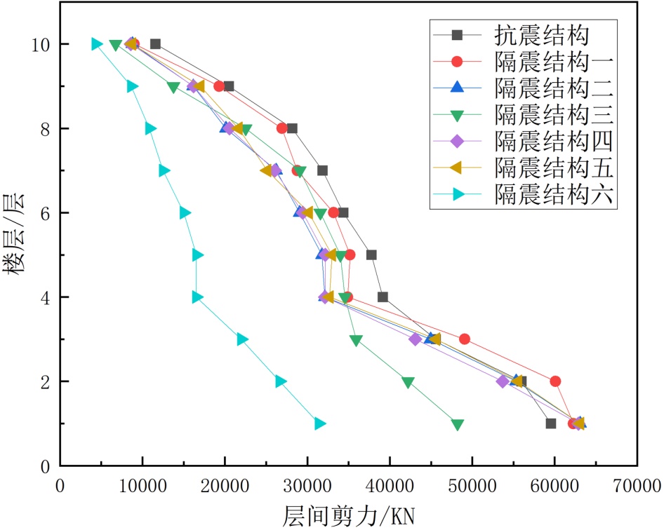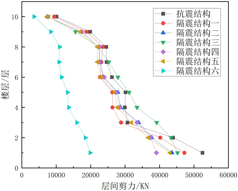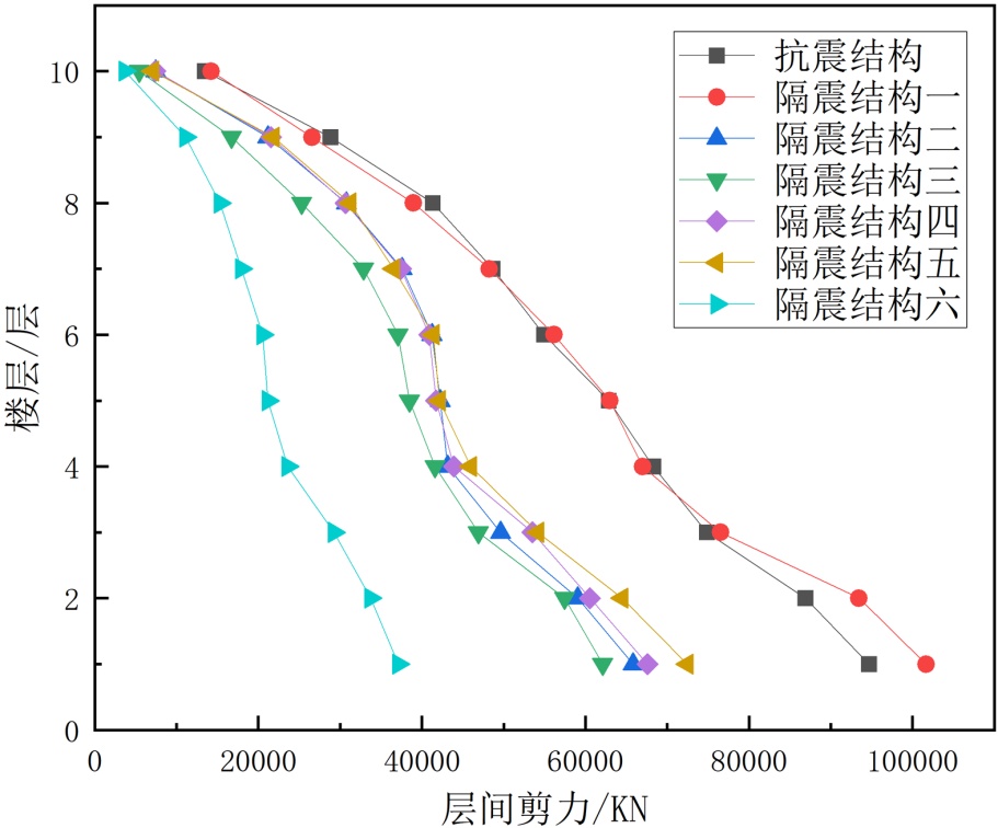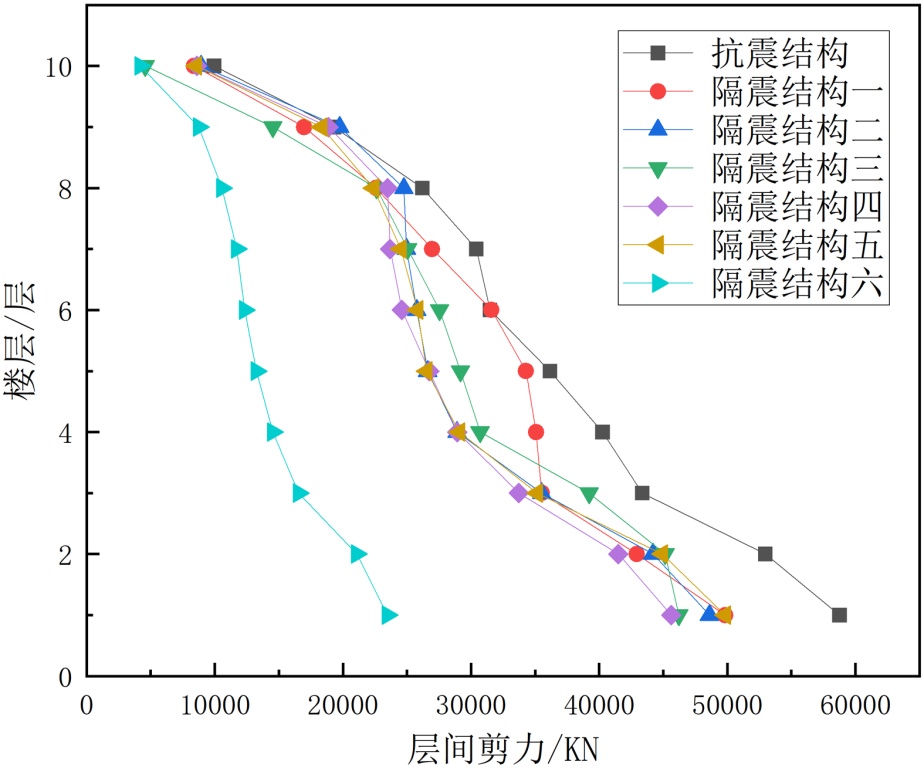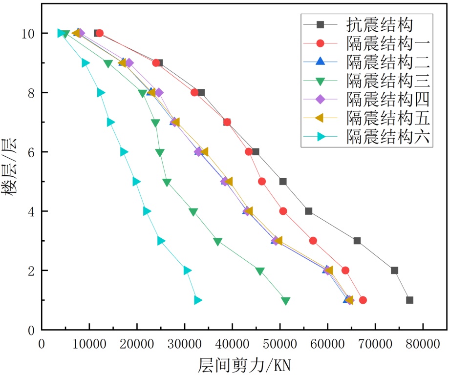 (1) 隔震结构六方案在延长结构自振周期、控制层间剪力、位移以及减少顶层隔震楼板位移等方面表现出更好的效果。