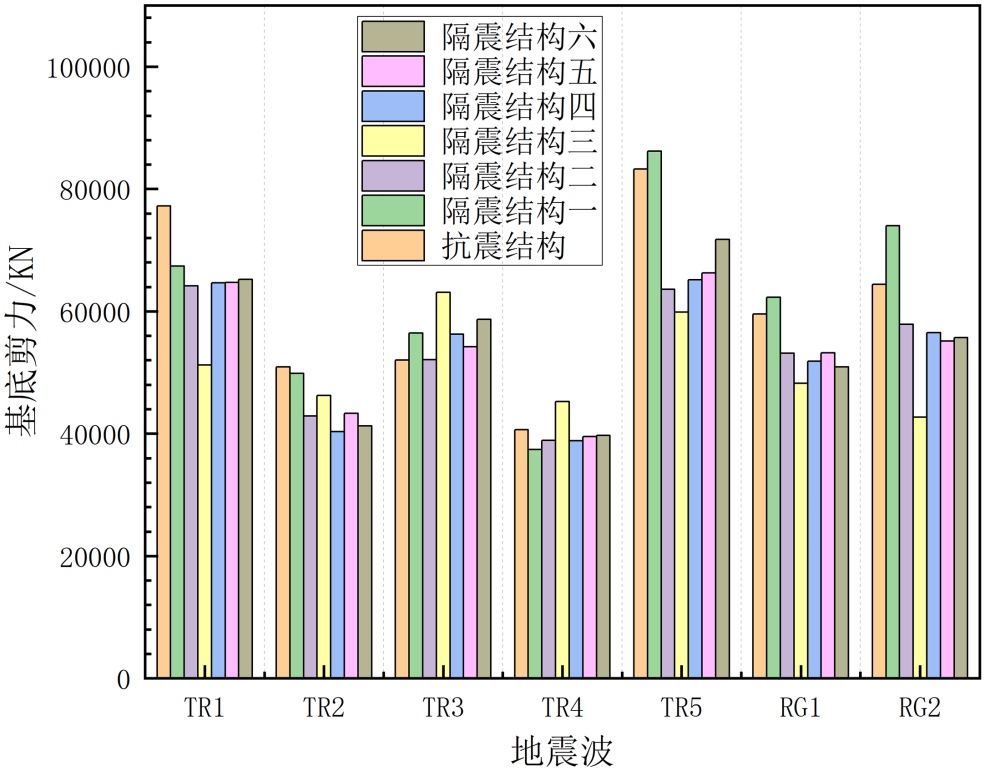 (1) 隔震技术的减震效率。如图7隔震结构基底剪力较抗震结构降低20%~40%,验证了隔震装置通过隔离上部结构惯性力向基础传递的有效性,尤其在强震波(如TR5波)作用下,隔震结构基底剪力仍能控制在60,000~70,000 kN,显著低于抗震结构的85,000 kN。