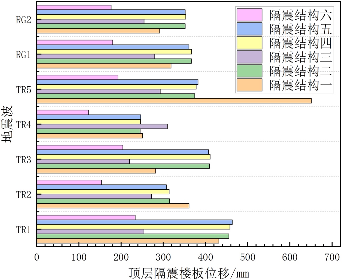 隔震结构三和隔震结构六在多数地震波下位移最小(如TR4波中均≤250 mm,RG1波中≤200 mm),推测其楼板隔震装置可能设置更合理或更优的刚度匹配,能够更有效耗散地震能量,从而降低顶层楼板的绝对位移。