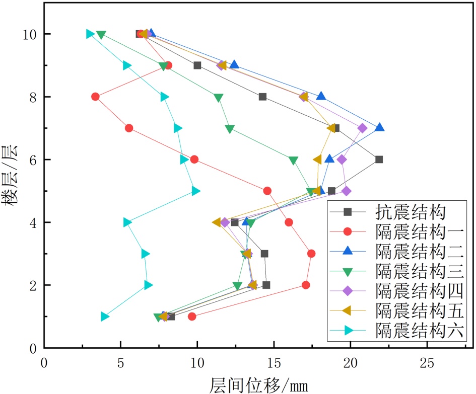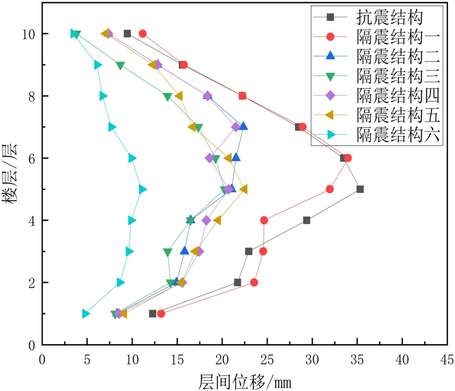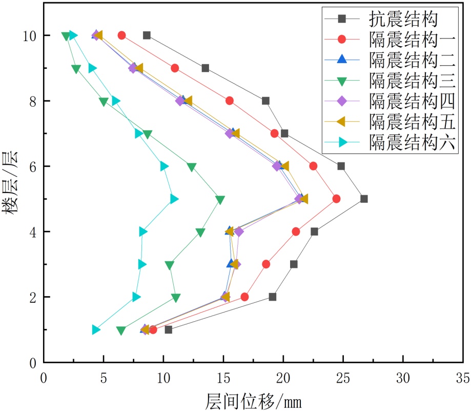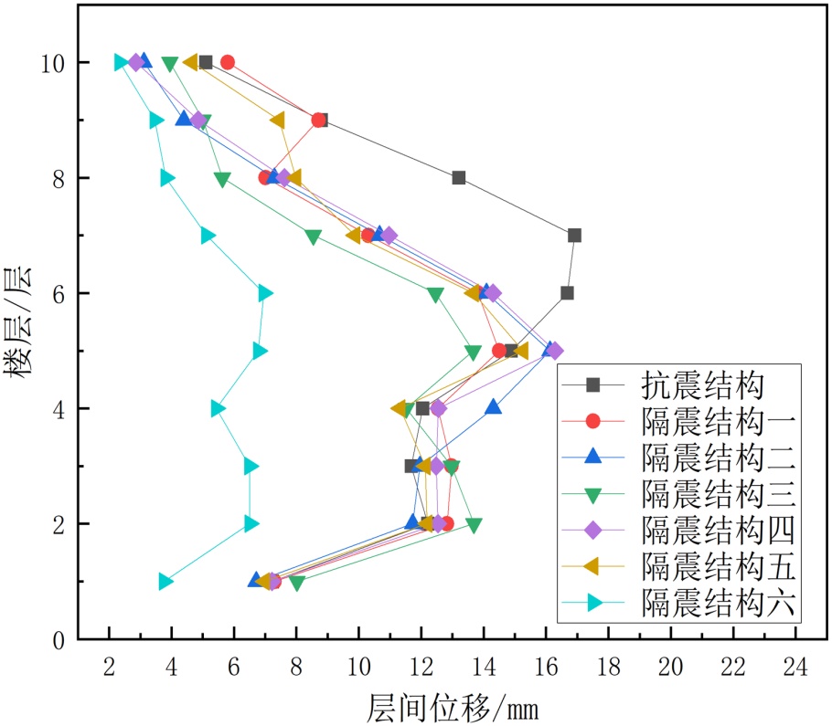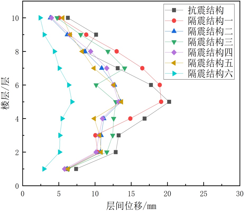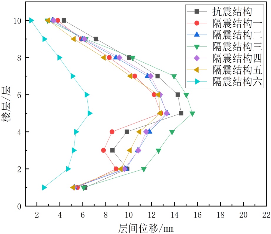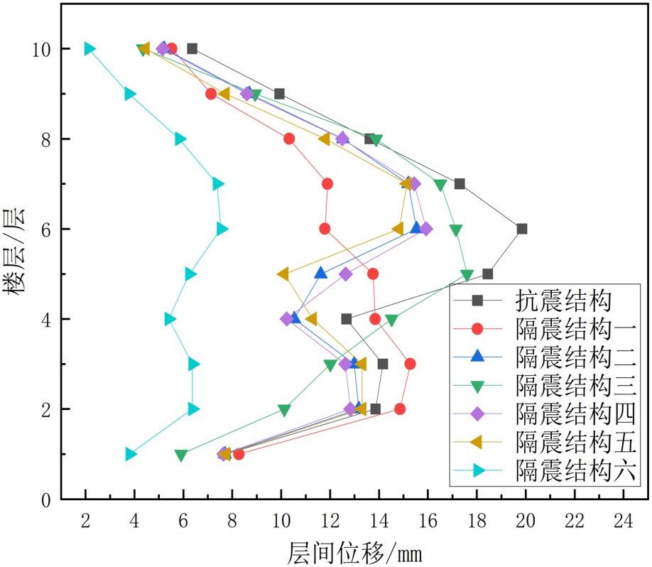(2) 楼层位置与位移响应的关联性。底层1~3层是层间位移的薄弱区域,所有结构类型在底层的位移值均为各楼层最大,且抗震结构与隔震结构的差异最显著(差值可达15~20 mm);中高层4~10层位移差异逐渐缩小,表明隔震技术对底层变形的控制效果尤为突出。