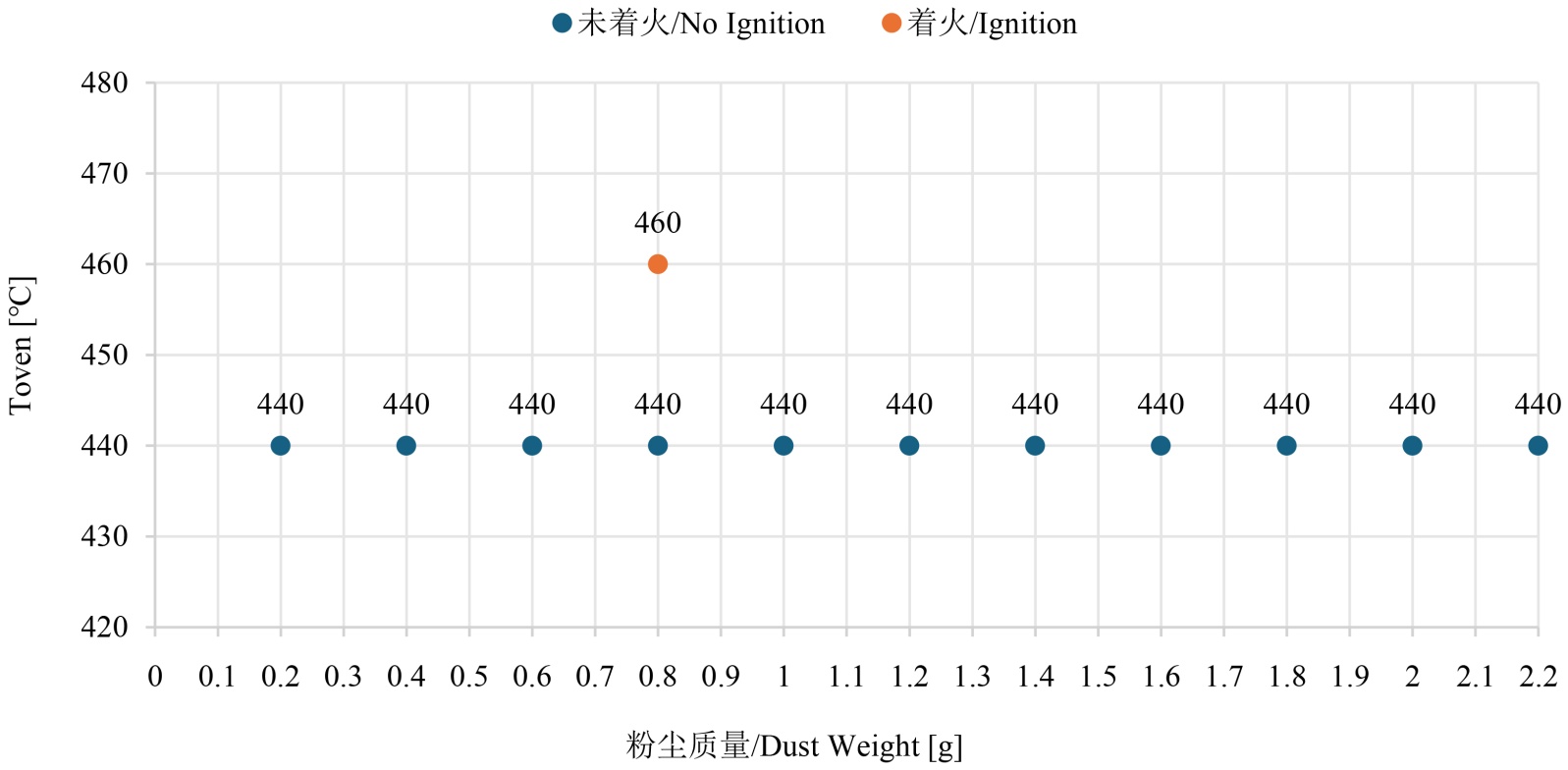 由此得出:在本实验条件下,发生着火最低温度L为460℃,炭黑粉尘云的最低着火温度MIT = 440℃。