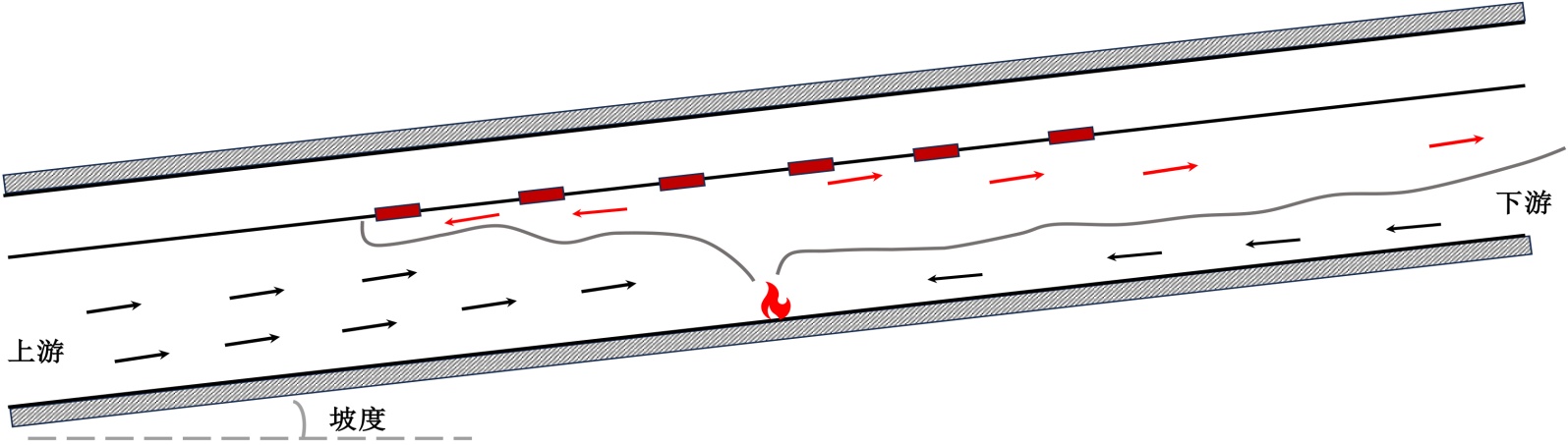 与纵向通风隧道临界风速控制策略相比,重点排烟系统的优势在于排出高温烟气并形成诱导气流。在倾斜隧道中,诱导气流速度进一步增加,即使在纵向通风速度未达到临界风速的情况下,诱导气流仍可实现对烟气的有效控制,将火灾烟气控制在一定的范围内。