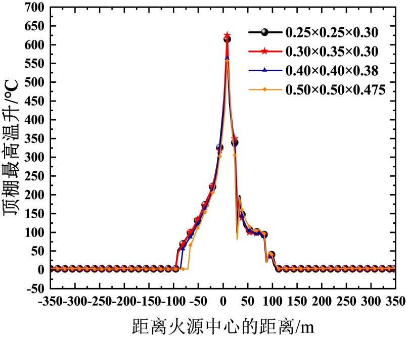 数值计算的准确性与网格尺寸密切相关,网格越小,计算精度越高,但计算时间会变长。网格尺寸与火源特征直径D*相关,D*可以由式(1)计算得到。式中Q为热释放速率(kW),ρa为空气密度(kg/m3),Cp为空气比定压热容(kJ/(kg∙K),Ta为环境温度(K),g为重力加速度(m/s2)。网格尺寸在D*/16~D*/4 (0.2875 m~1.15 m)之间时计算结果较为合理。当网格尺寸小于0.3 m时,顶棚最高温升结果差异较小,故选取网格0.3 m × 0.35 m × 0.3 m,如图2所示。