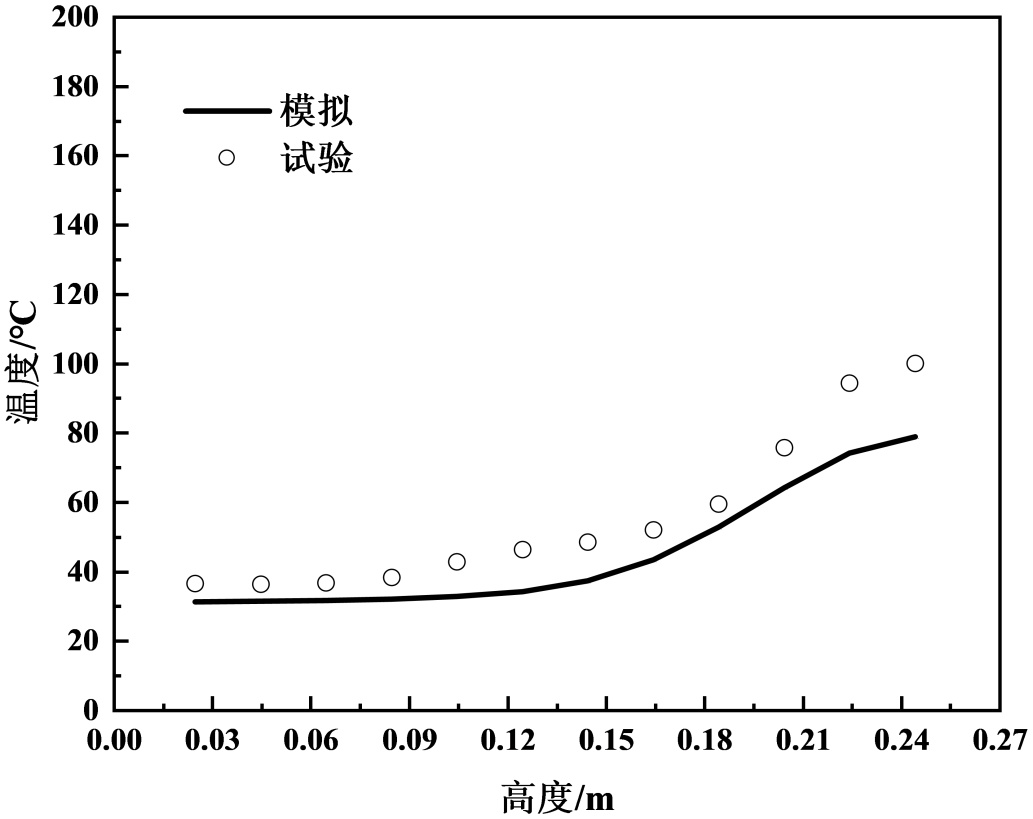 本文选择与刘英利[13]开展的小尺寸试验数据进行比较。该实体隧道长10 m、宽0.6 m、高0.27 m,外界环境温度为28.5℃ ± 2.5℃,模型隧道的顶部、底部和一侧材质为30 mm厚硅酸铝防火板,密度为300 kg/m3,导热系数为0.035 W/m/K。另一侧材质为8 mm厚,耐温1200℃的防火玻璃,密度为2200 kg/m3,导热系数为1.4 W/m/K。排烟口上方静压箱采用镀锌铁皮制作,外表面包覆20 mm厚橡塑保温棉,保温棉导热系数为0.034 W/m/K。火源燃料为丙烷,火源功率为2.8 kW,对数值模拟和缩尺试验中距离火源1.5 m处的竖向温度进行对比,发现结果吻合较好,如图3所示,表明采用的数值计算方法和模型设置的合理性。